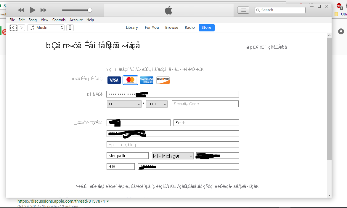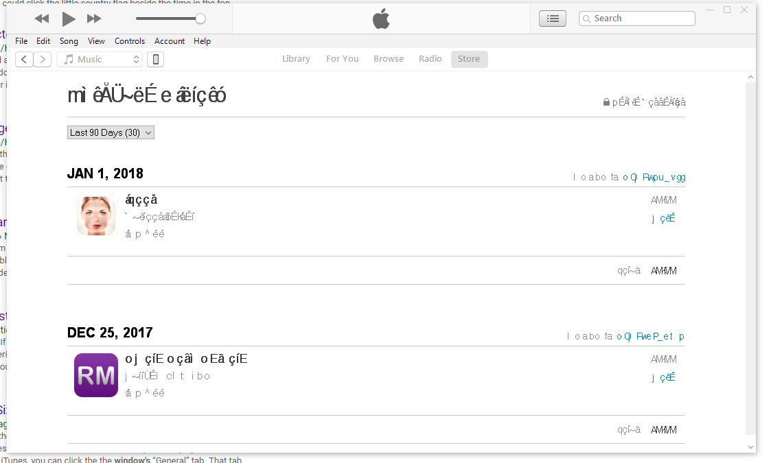 I am trying to check on purchases on my account using iTunes on my Windows 10 computer and every time I open one of the account pages, all the text changes to strange characters and symbols. This ONLY happens when I try to go to an account detail page. It does not happen when backing up my phone, looking at content or playlists, etc. I can not find anyone with this problem using a internet search. Need help fixing ASAP!