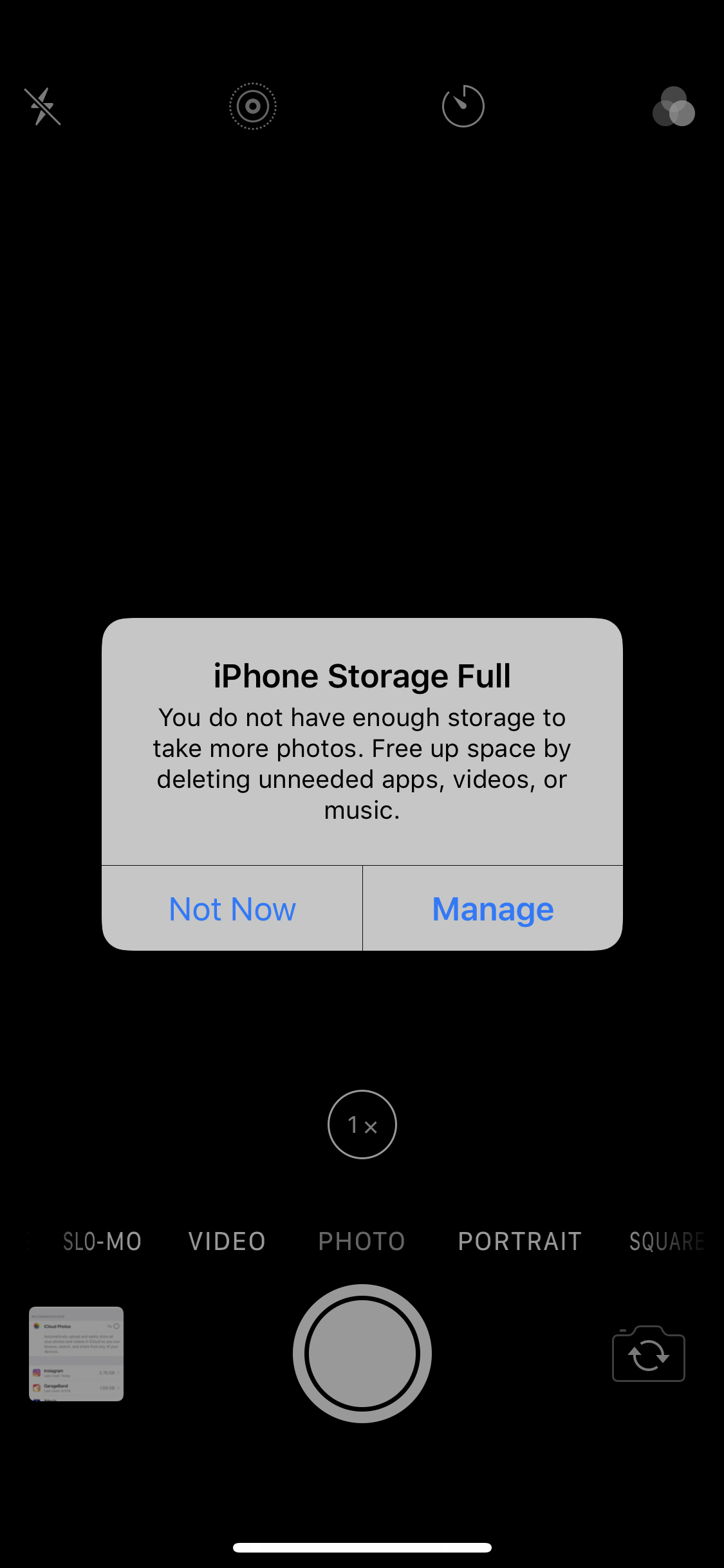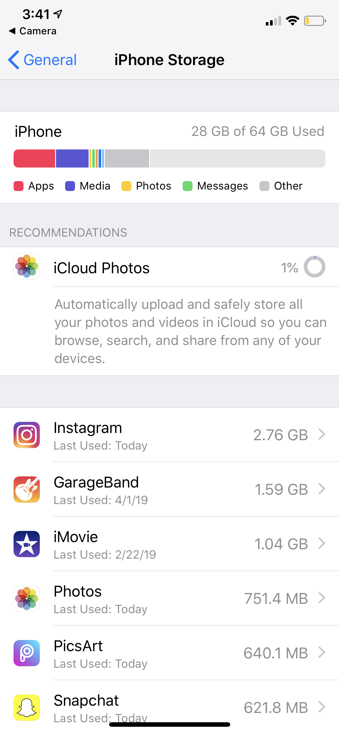 I have a 64 GB iPhone X, and it is telling me that I am completely out of storage. I cannot take pictures or videos, or open the mail app. When I check Settings>General>iPhone Storage, it tells me that less than 30 GB of the 64 GB have been used.