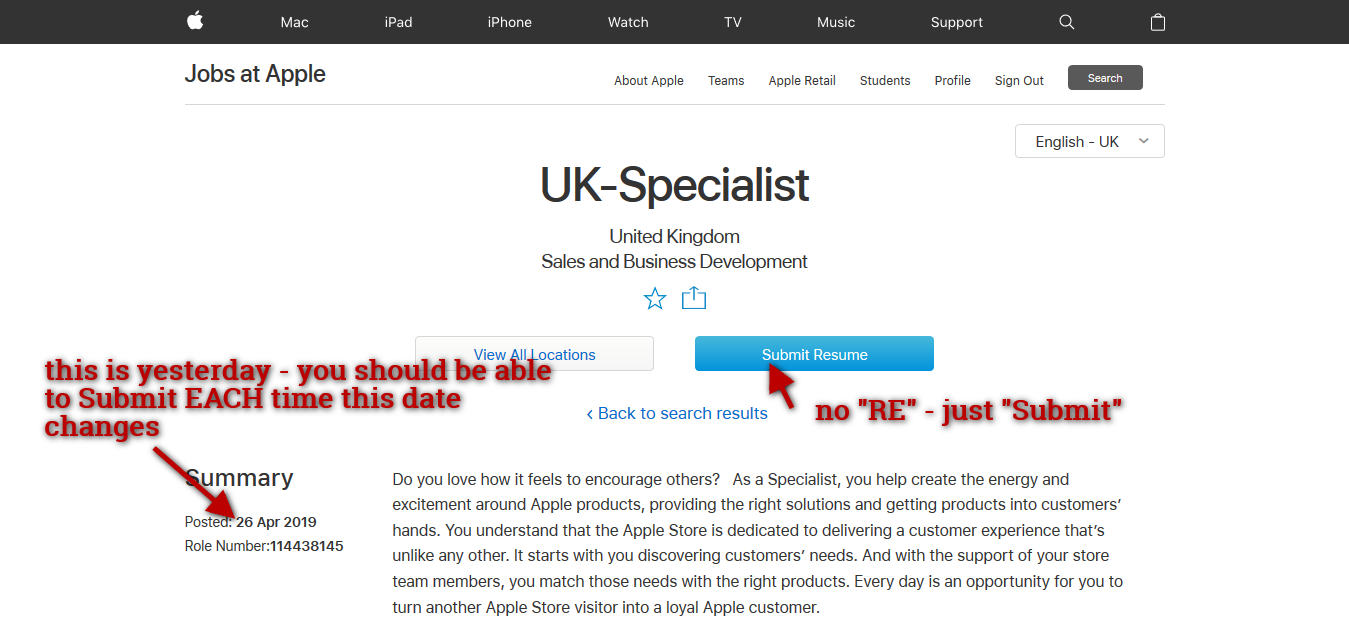You can only apply for jobs on Apple if you sign in with your Apple ID, so when I sign in it automatically changes to "Resubmit" as I have applied for the role of Specialist in the past. The role does not change each day, only the date changes, it is the same role but with a different date so I don't think that is relevant to the issue unfortunately. I have tried with both Chrome and Safari browsers and also on both Mac and Windows platforms.