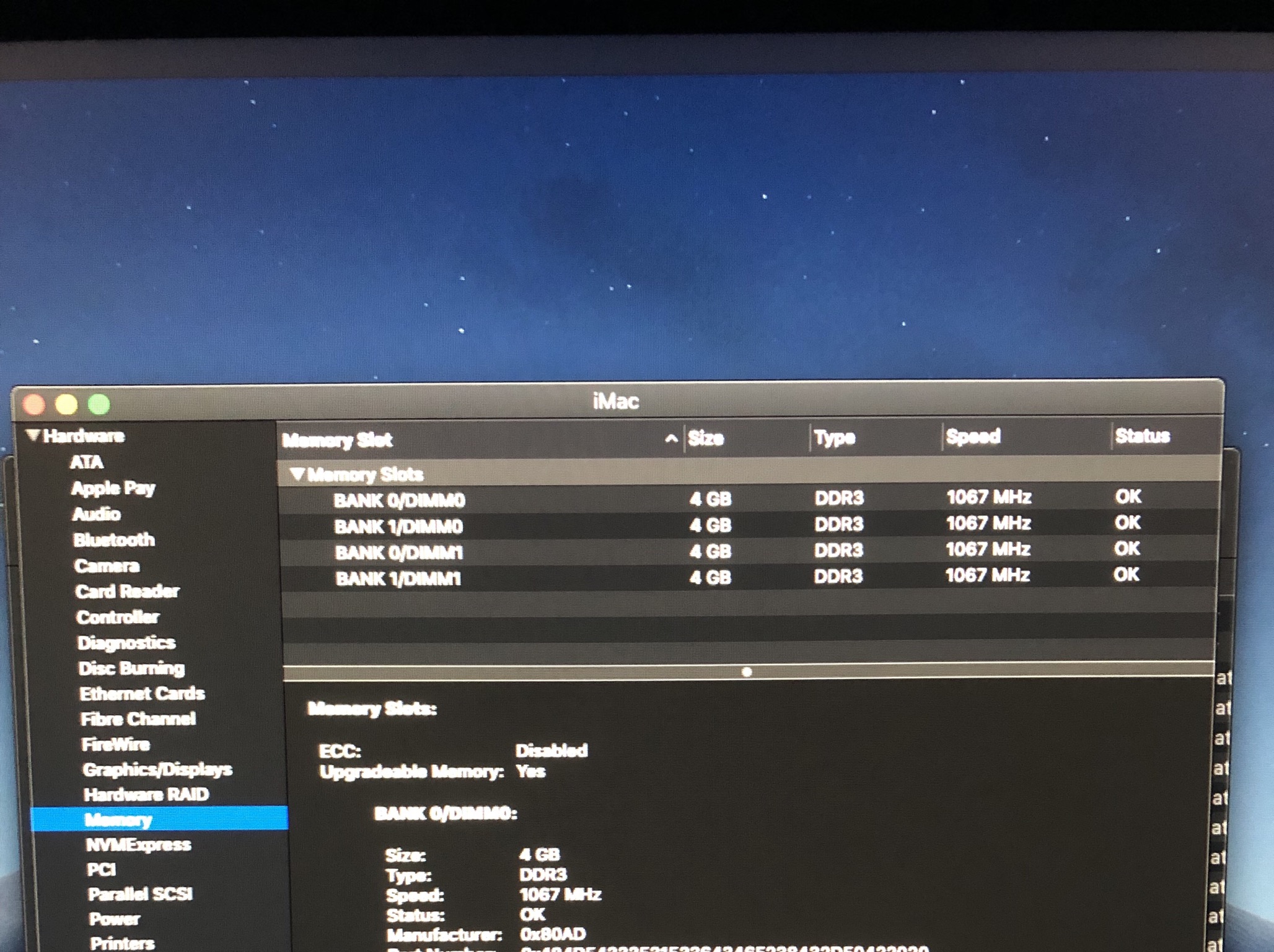 The reason I asked is because I just bought a second hand late 2012 iMac and it shows under ‘about this Mac ‘ that it had 16GB 1067MHz DDR3 Ram installed.