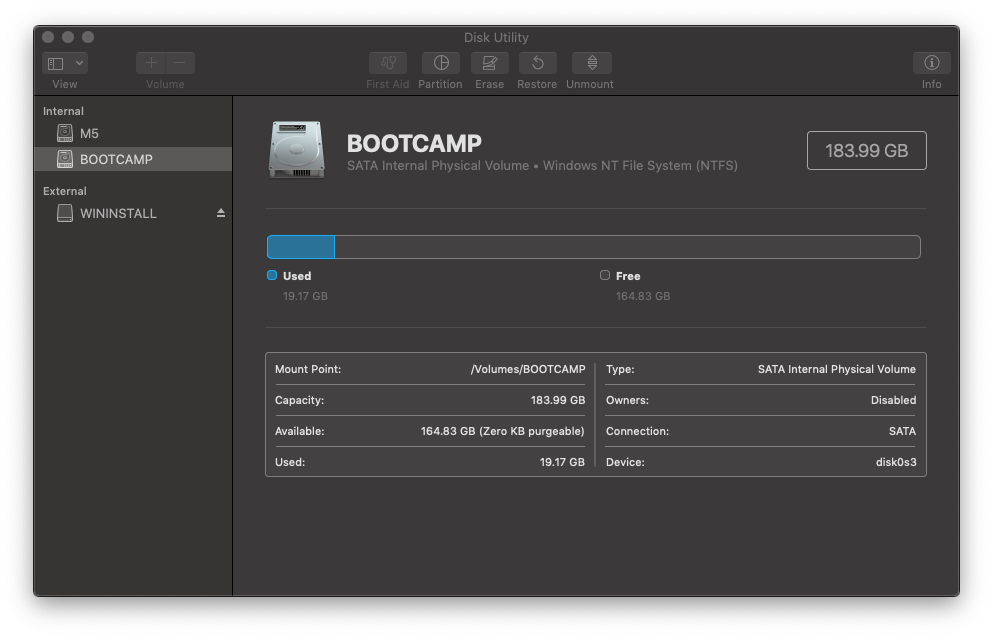 5:       Microsoft Basic Data BOOTCAMP                255.4 GB   disk0s5