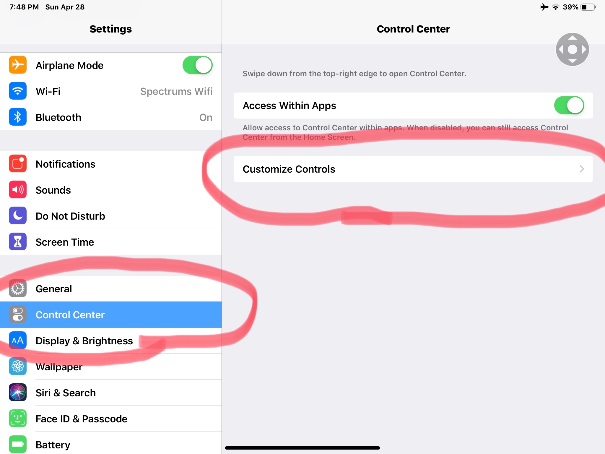 First, under SETTINGS, choose CONTROL CENTER. Then, choose CUSTOMIZE CONTROLS:
