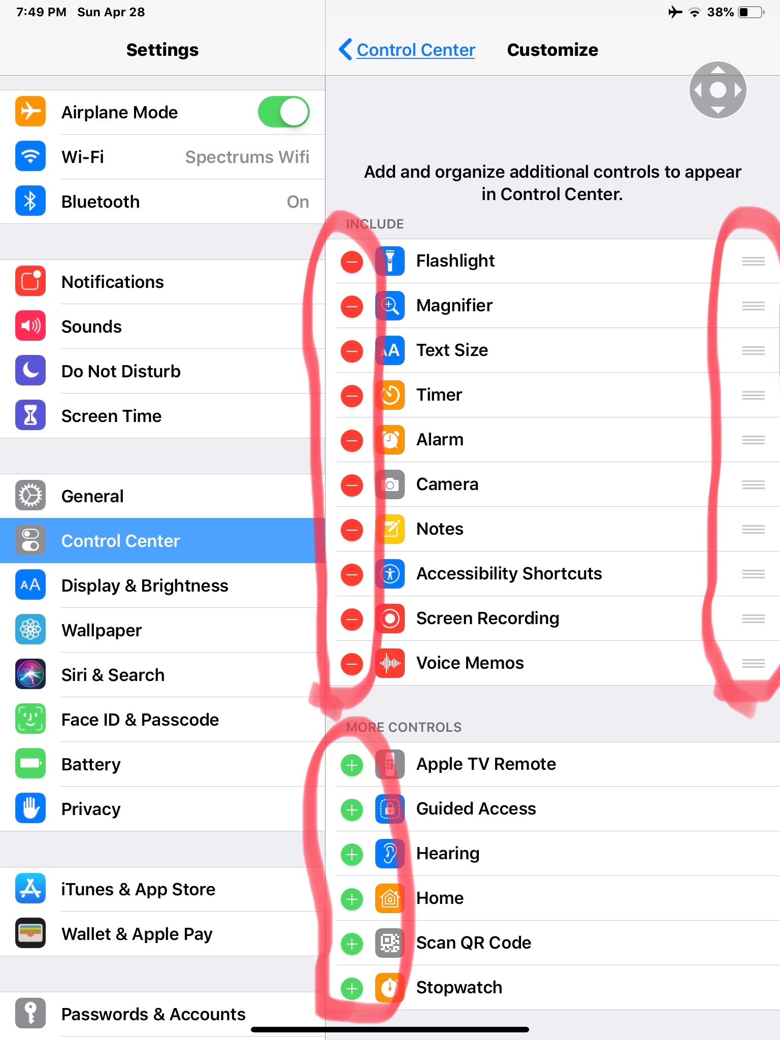 The red buttons are pressed to REMOVE one from those showing on your Control Panel. The green buttons are pressed to ADD one you’d like to have on your control panel, displayed for ease of use.