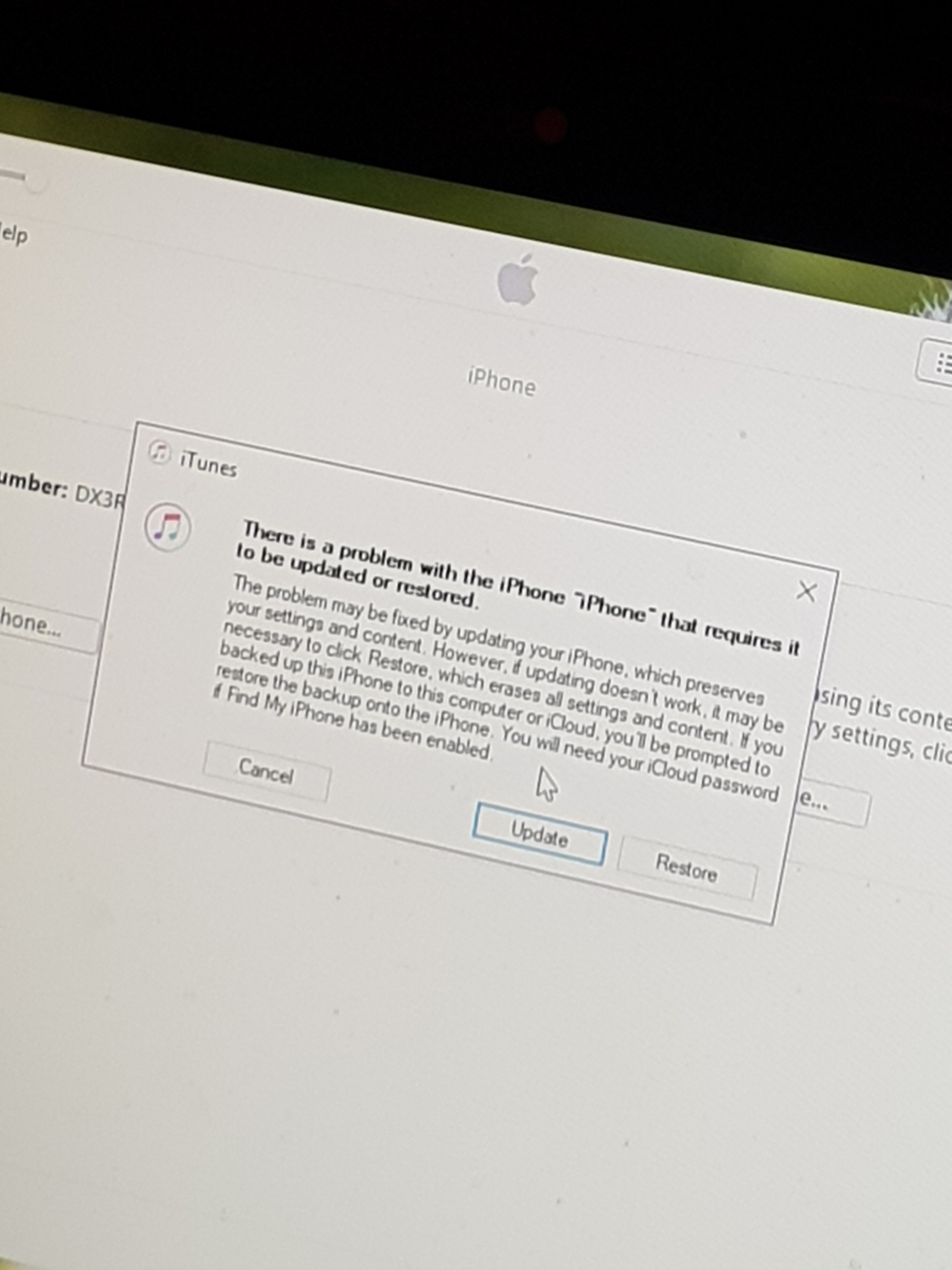 Then when it restarts it tells me again that there is a problem with the iPhone and it needs to be updated or restored.