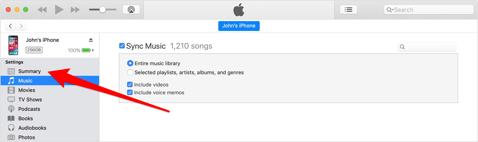 When the device is recognized in iTunes, this is what you should see on the left side.
