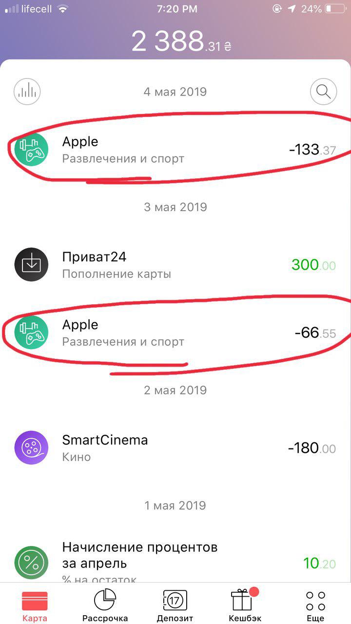 But I do not understand why Apple wrote off this $2.49 3th of May and after one day 4th of May I had minus on my credit card in amount of $5(about 133 UAH in Ukrainian Hryvna).
