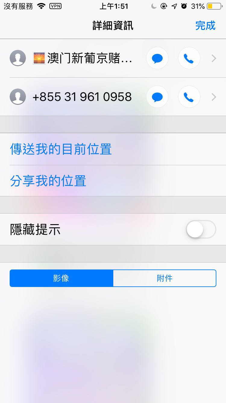 one sender has a phone number +855319610958 , the other sender has a name "🌅澳门新葡京赌场招聘代理" but does not have a phone number or email address.
