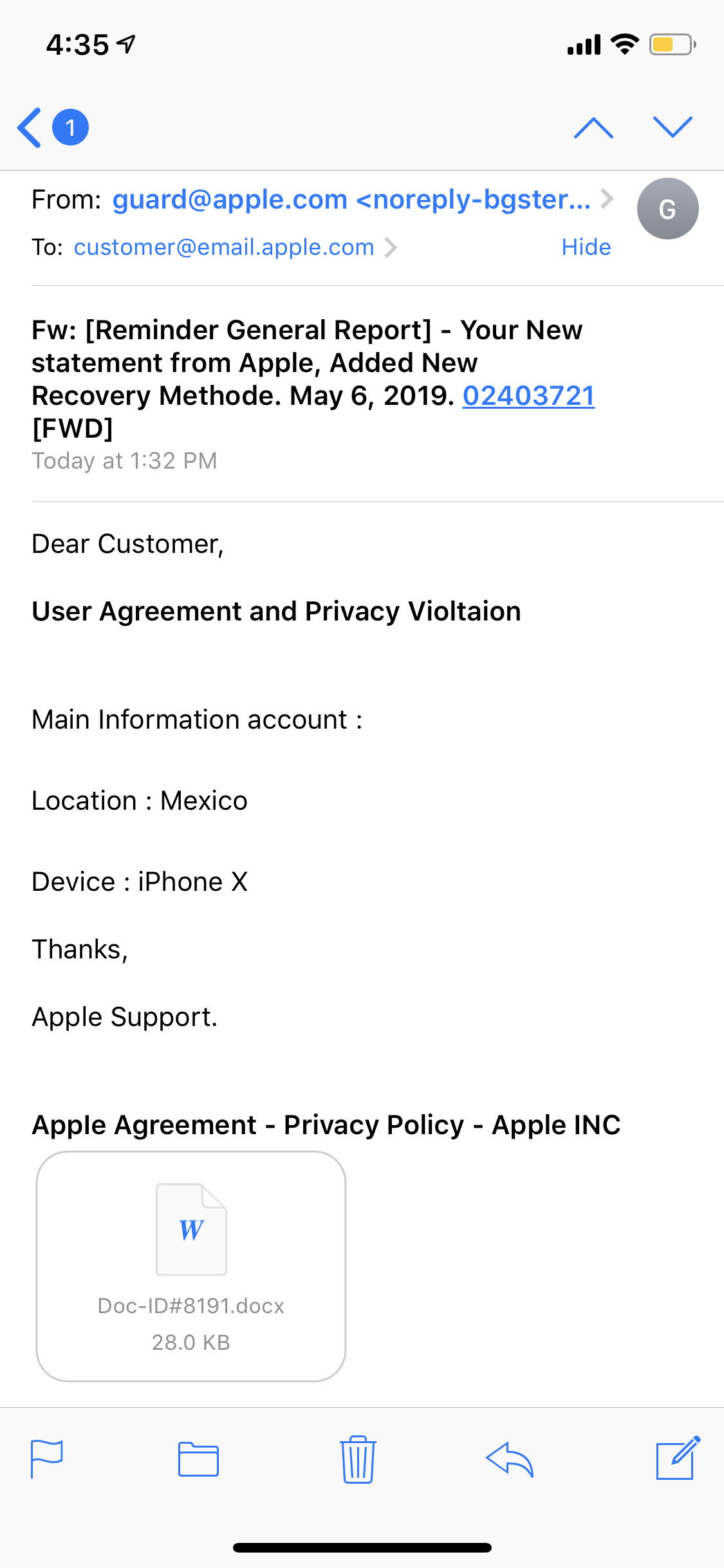 It's phishing. In a message Apple will always address you by your real name, never by your email address or Dear Customer. Also the sent-from address should be @apple.com or @itunes.com Additionally Apple does not send attachments.