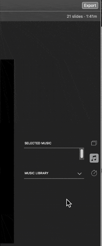 Selecting the music (checkmark shows) does NOT add the music to the slideshow. Clicking play or preview or export all play / save the slides with the default music rather than the selection.