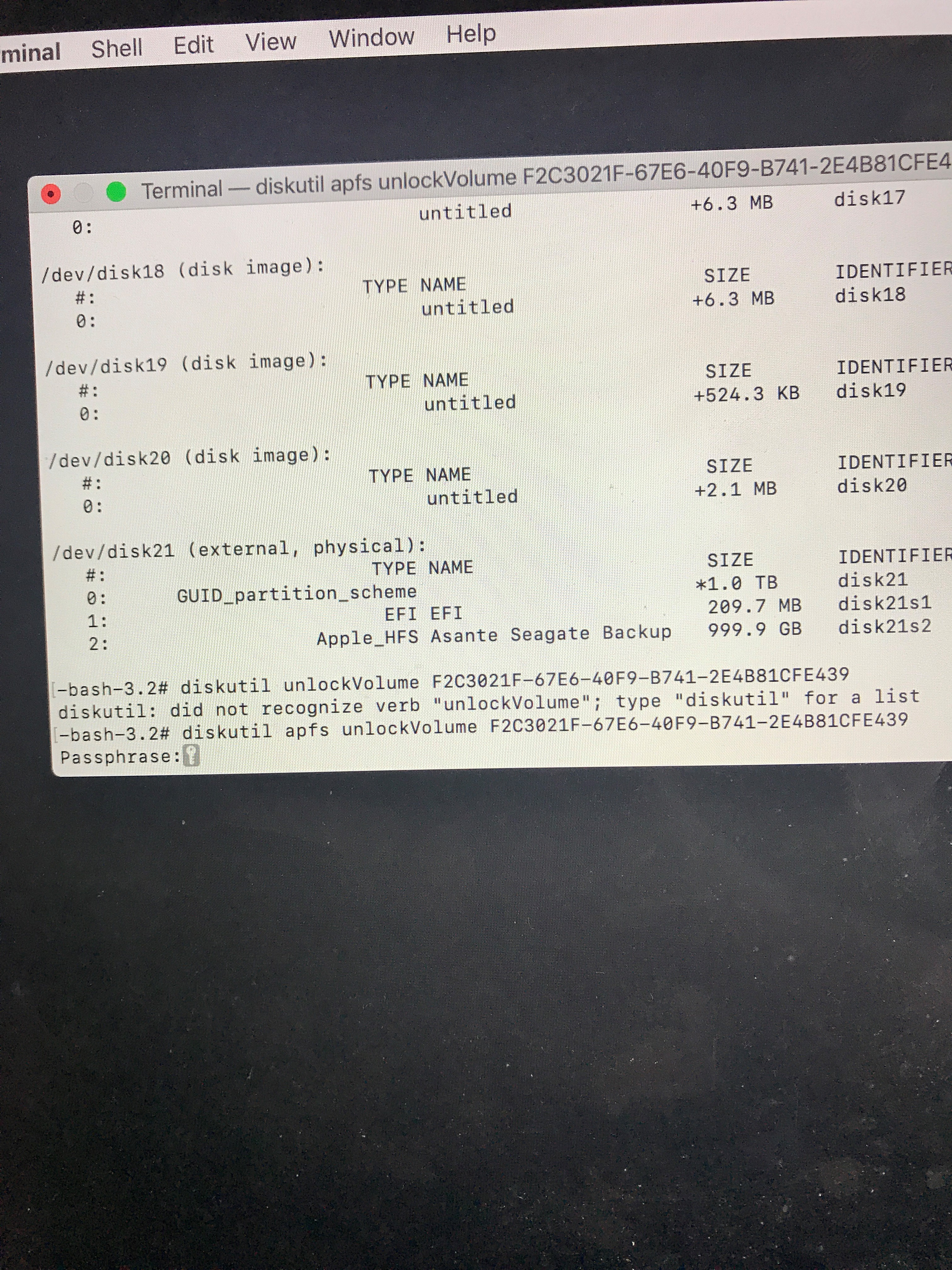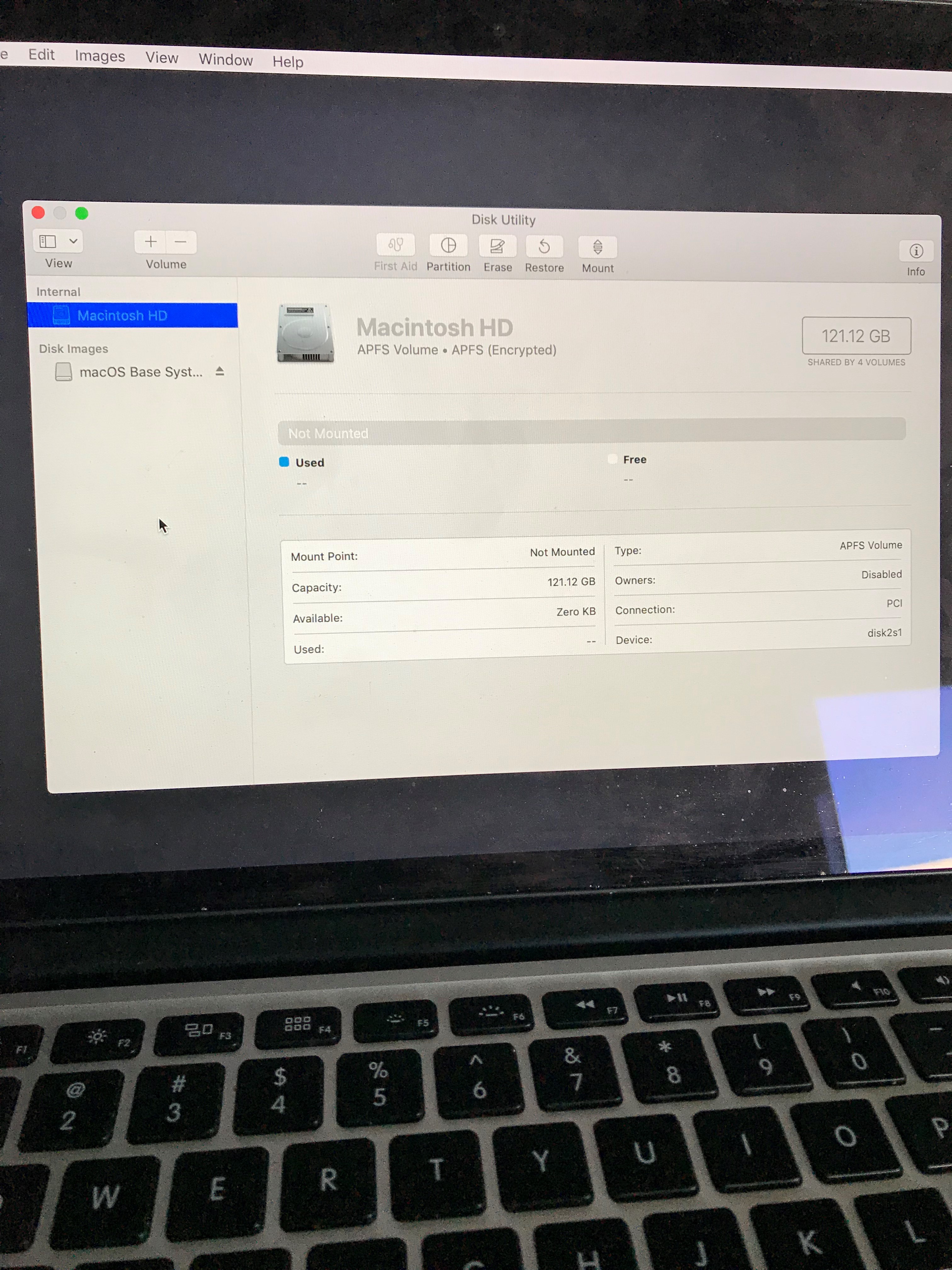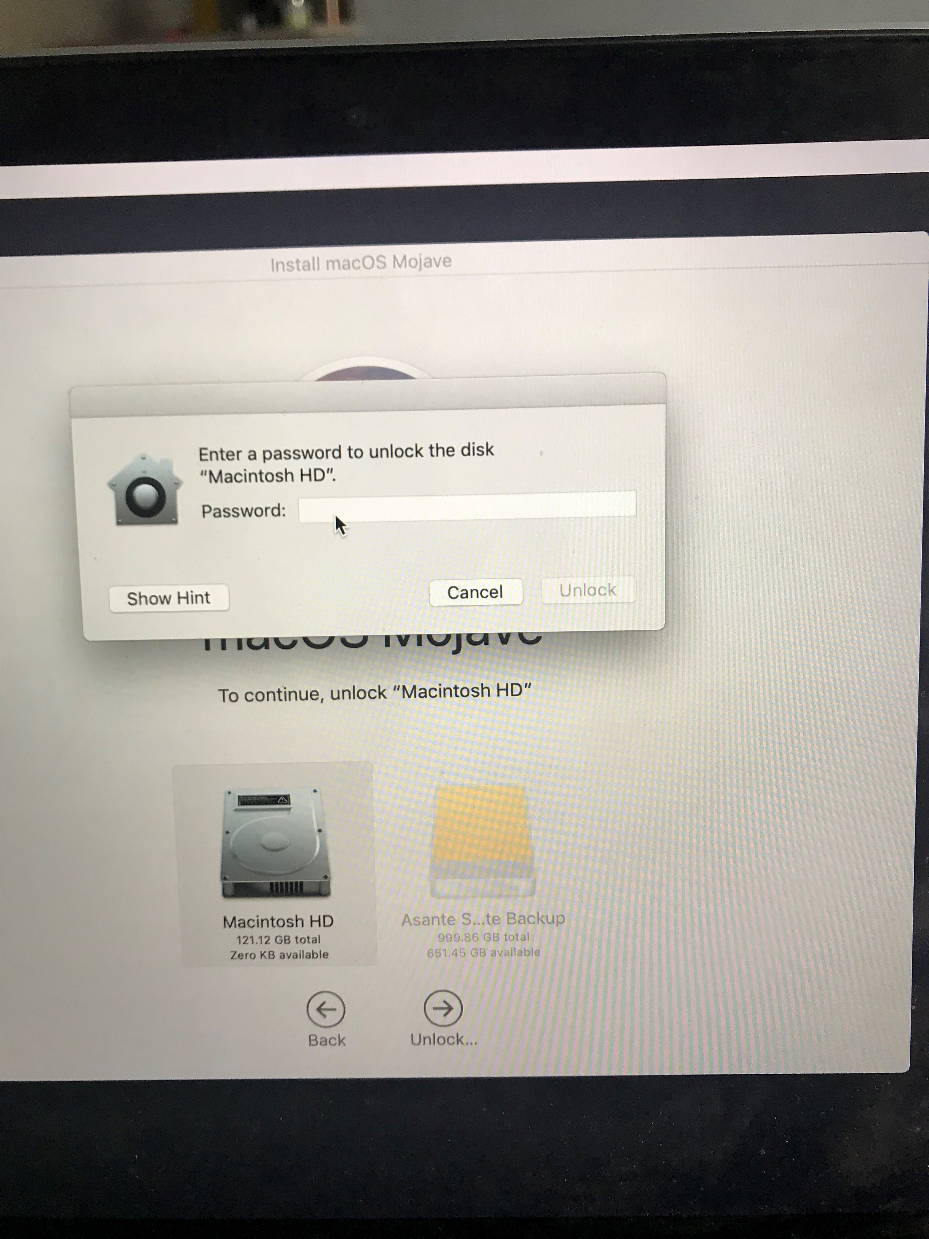 Macintosh HD crashed when I reached the storage limit on my machine. I was prompted to force quit applications, but the screen was frozen. I did a hard reset, and when turning the Pro back on, it appears my Mac cannot locate the internal hard drive. In attempts to resolve, I am booting up in recovery mode. I have attempted to mount via Disk Utility, as well as reinstalling the OS (I was on the most recent, Mojave, prior to the crash). I also tried entering the password through the Terminal.