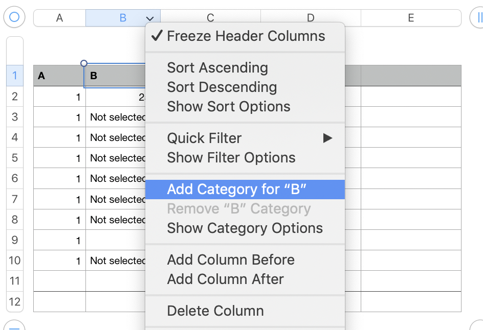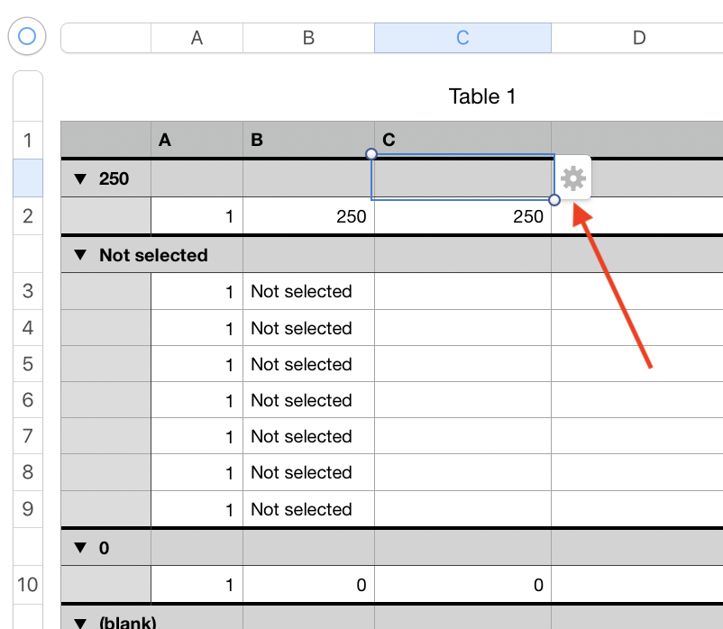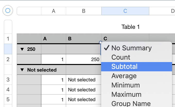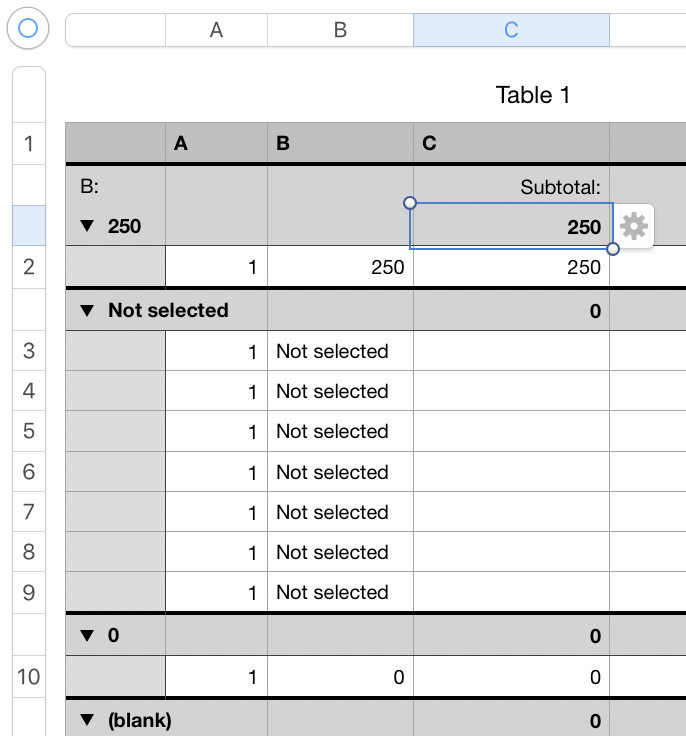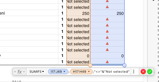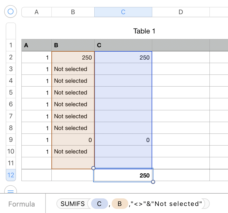 I need to sum column C but only rows which contain some number in column B. If column B is "Not selected" it will be filtered out and should not be counted in SUM.