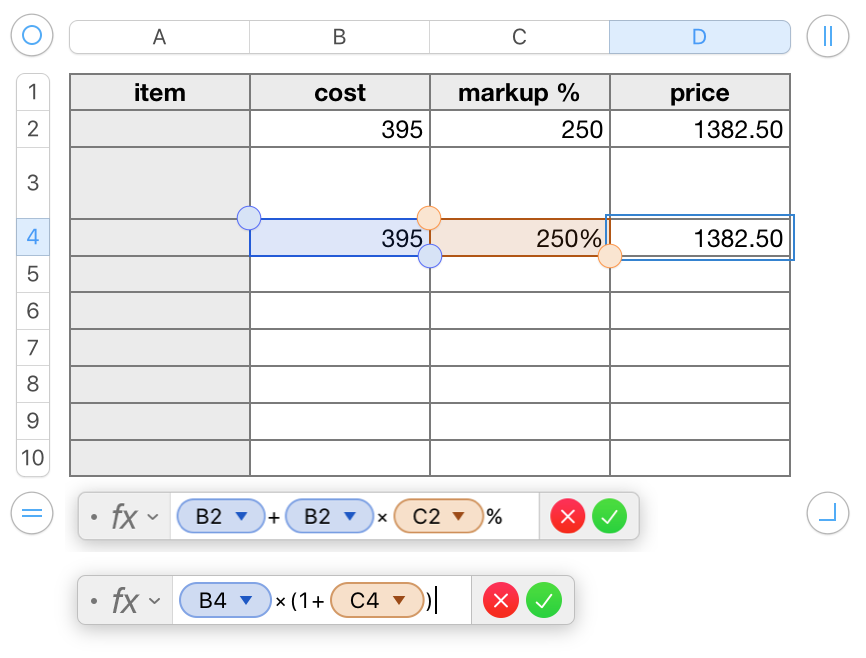 B2 gets the cost value from cell B2. The second B2 gets the same value from B2, x (entered as * ) multiplies that value by the the markup factor in C2, read as a percentage due to the % operator attached to the cell reference, and + adds the two results.