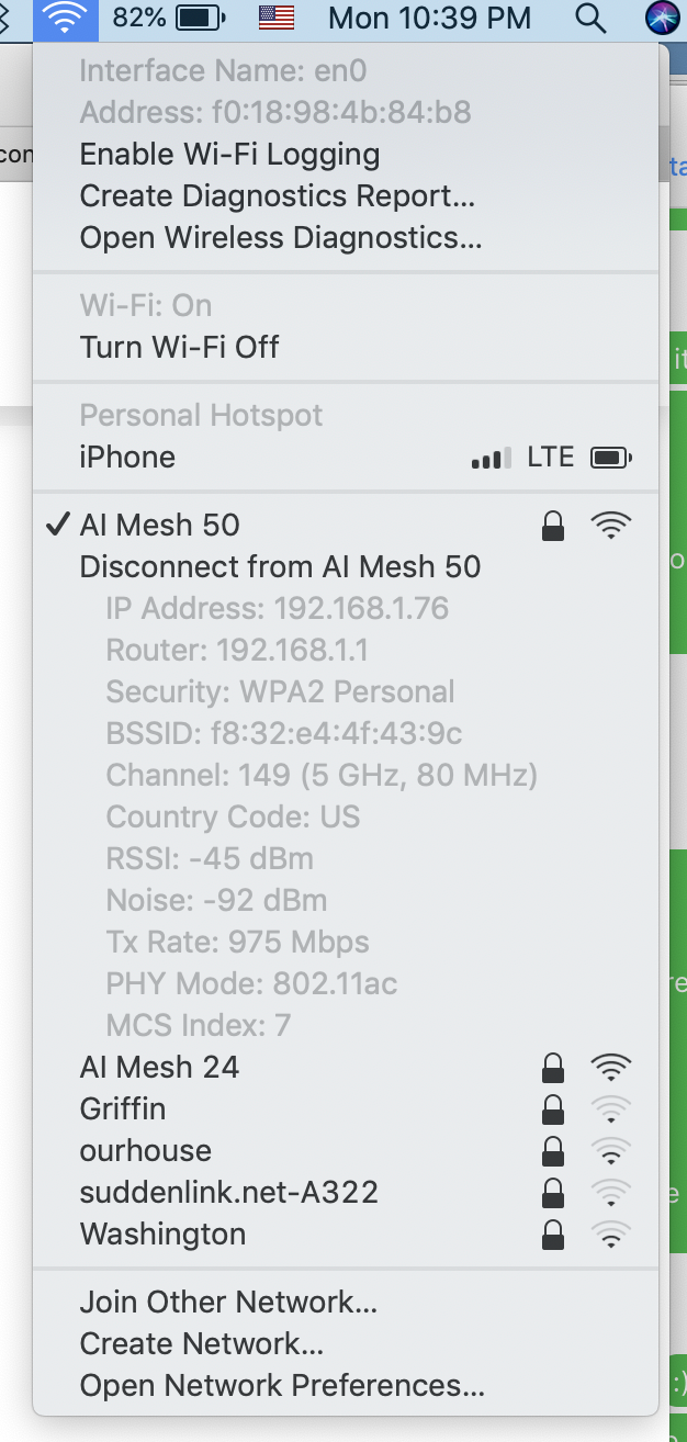 If I sit in the central area (the living room), it sees the primary router at 95% and the AiMesh node at 65%(ish) according to WifiExplorer. Whenever the MBP detects both with a decent signal like that it will connect, drop the wifi after about 30 seconds, and never reconnect.