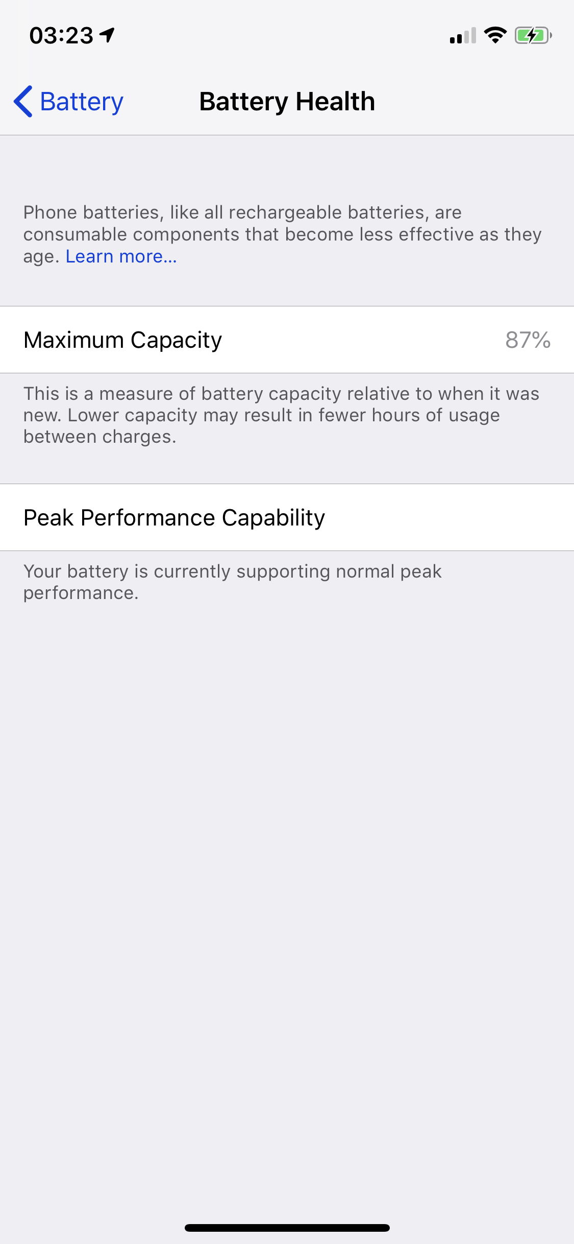Now as of this recent update (12.3.1), siri works again & now the battery health shows up. This time stating 87% on the Maximum status tab. It also says I’m still operating under normal Peak Performance Capability.