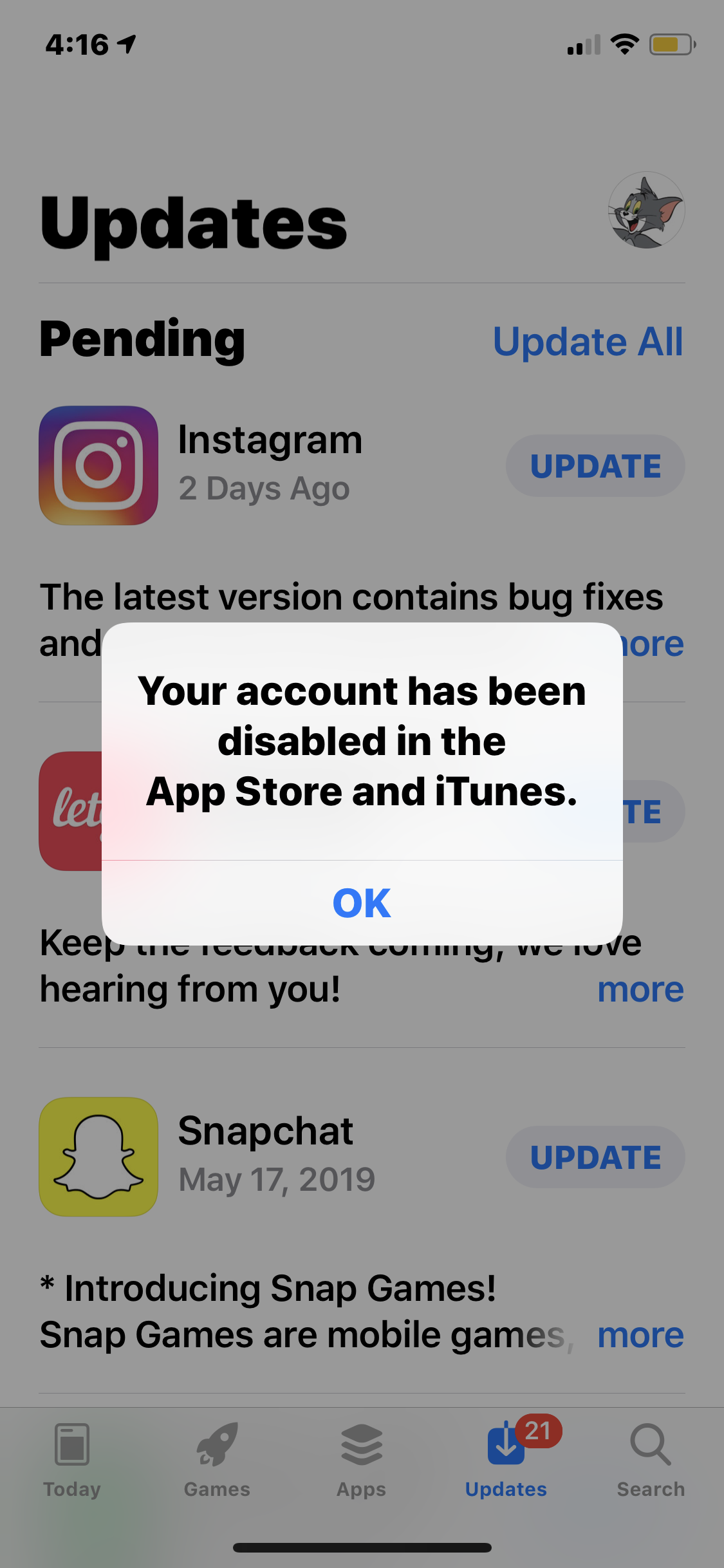 When I try to download/update an app it says “ your account has been disabled in the App Store and iTunes”. How can I fix this