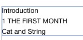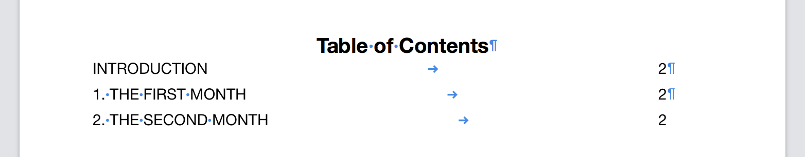 Here is how it looks (below) in the table of contents. It shows up as TWO entries. Is there a way to edit JUST the table of contents, and NOT the actual layout on the appropriate page within the document? I want the chapter title to read as "1 THE FIRST MONTH" all in one line.