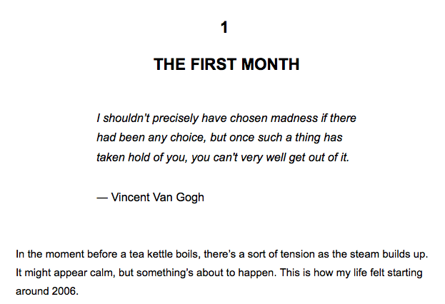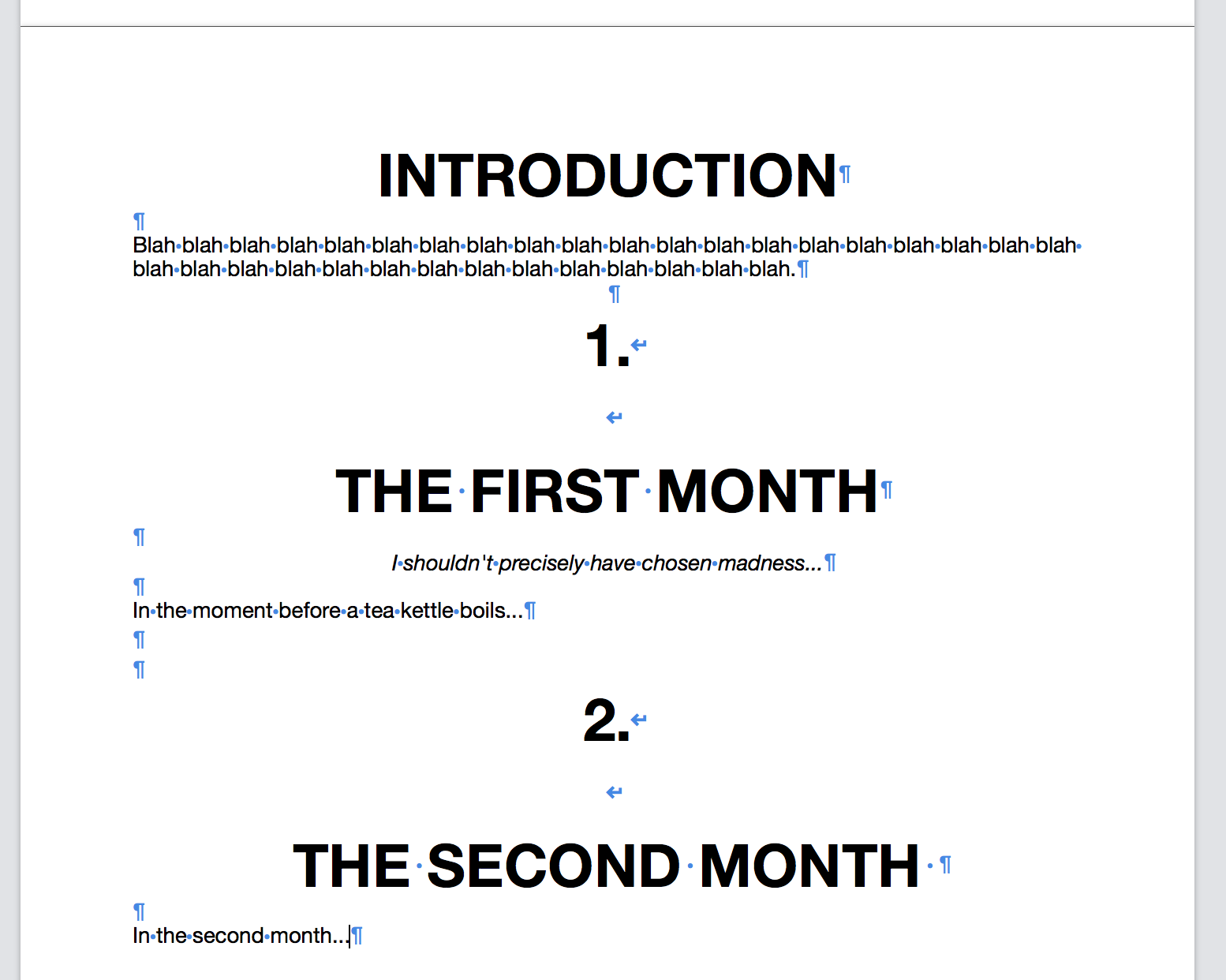 Here is how it looks (below) in the table of contents. It shows up as TWO entries. Is there a way to edit JUST the table of contents, and NOT the actual layout on the appropriate page within the document? I want the chapter title to read as "1 THE FIRST MONTH" all in one line.