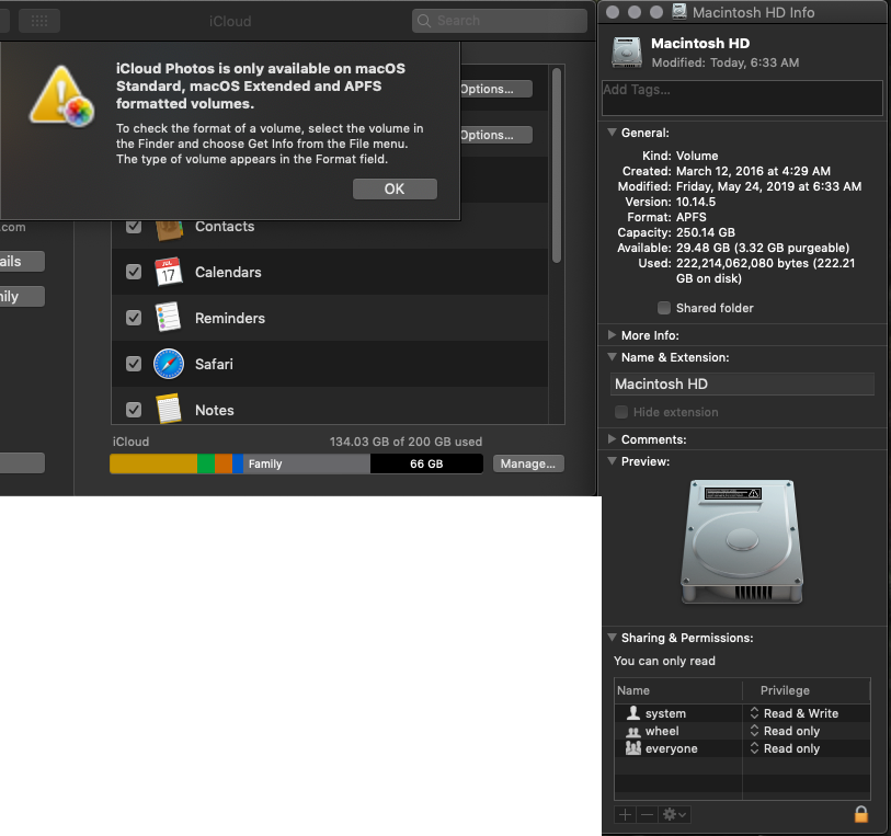 My photos.app on both my Mac and iPhone have been syncing flawlessly for years. This morning I noticed pictures and folders stopped syncing. When I looked at my iCloud system preference, I saw the Photos checkbox was unchecked. When I tried to enable it, I got an error that iCloud photos is only available on macOS Standard, macOS Extended and APFS formatted volumes. My drive is formatted APFS. Any ideas? Again, iCloud photos has been working for a long time, and the only recent change I made to my Mac was updating the OS to 10.14.5 yesterday -- I'm guessing that is to blame??