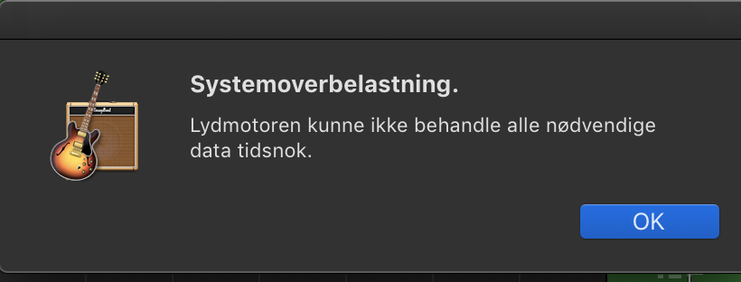 Hi! I have a brand new MacBook Pro -running OS Mojave v 10.14.5. Even if I close all other apps and programs when I'm working in Garage Band (with I use without any extras...just plain as it is), I'm constantly interrupted with this error-message that says: System Overload. The Sound/Audio Engine cannot .... with you data in time... I´s unbelievably annoying and frustrating....! I have installed 8Gb memory, have the latest software installed, and yes: I have tried the "freeze-tracks-method"... Still I get this #$%&/()=?)(ÅP/O&/)%&$()%/(&)/ message.... Pleeaaase help me!!
