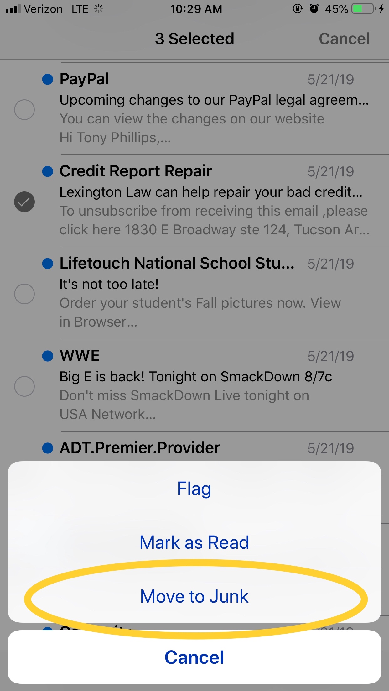 This is the “tricky” part. You do NOT select Move or you will get a grayed out Junk folder again. Instead select Mark.
