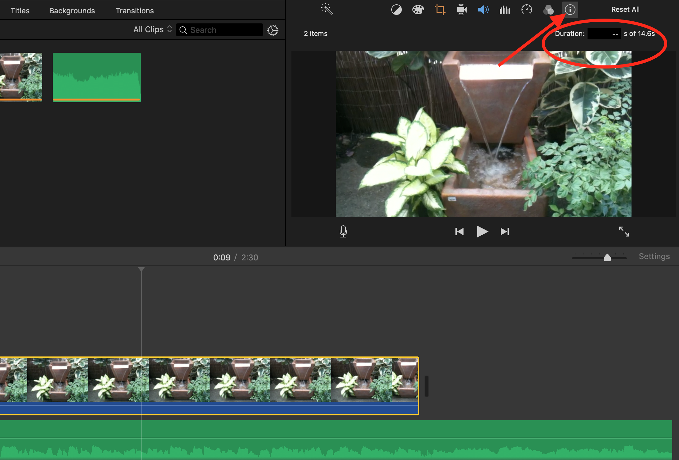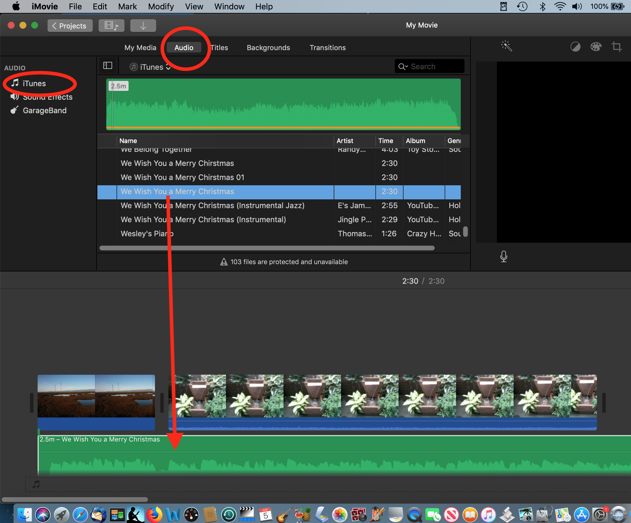 As for inserting a song, you can either drag it in to the timeline from your desktop, if that's where you have stored it, or you can click on the iTunes item in the Audio sidebar of an iMovie project and drag it in from the list of songs that is displayed.