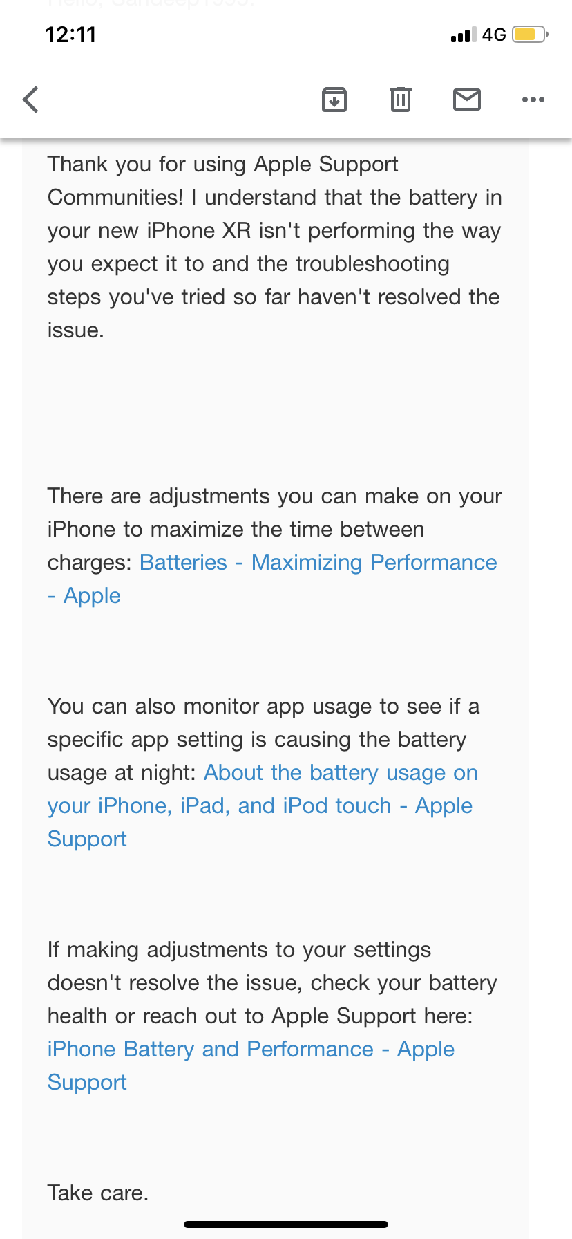 A reply from Apple directly. First of all it’s not about my expectations on how the battery should behave. It’s about how the specifications say it should be. Everything I’ve done and went through is just again and again mentioned to follow and monitor there’s nothing new said by them. As I’ve said before on this discussion, many reigns and countries don’t have Apple stores or genius bars at all. And authorized salesman are clueless and confused when we present them with such issues. And for all of you with older devices, do not worry this has nothing to do with making just those devices useless since mine is a model which came out literally less than an year ago. I specially choose XR because of the battery life. Now I’m dreadfully watching the battery drop at doing nothing at all. And it’s been over a month now still with no fix or a proper update. Just finished my university degree on may and if I were to attend lectures the battery will be dead before I’d even make it back home. Highly disappointed and will never ever purchase an Apple product again.