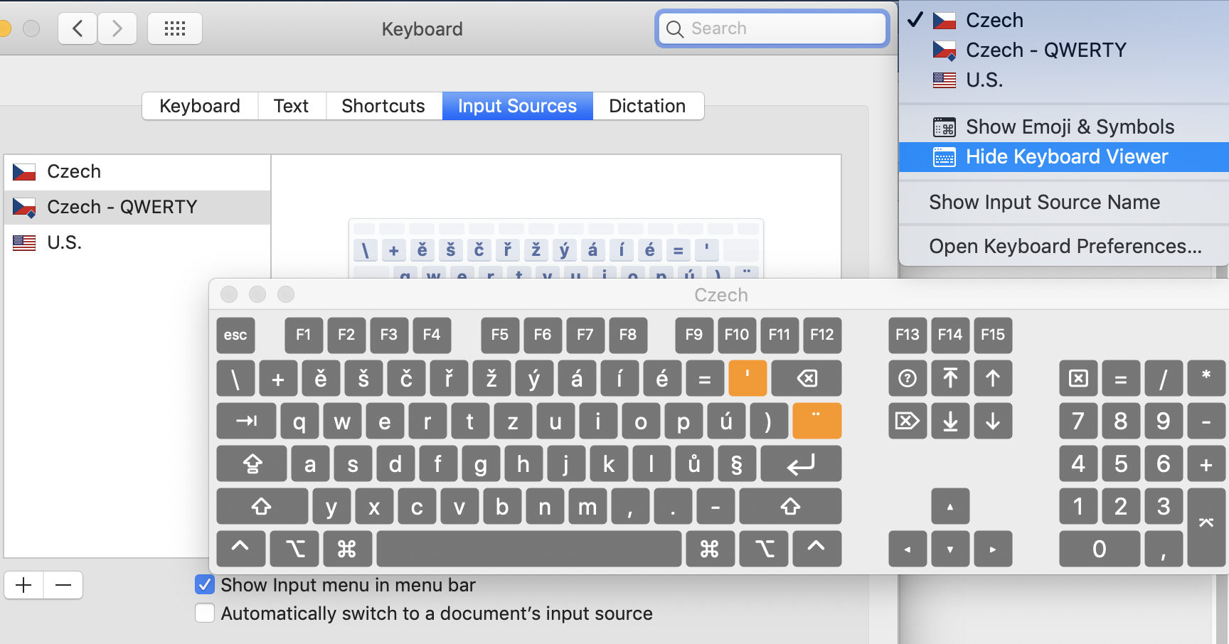 Keep in mind there are two different Czech keyboard layouts so you will want to see which one you have. When you key to Apple logo menu- System Preferences, Keyboard icon, you can go to the Input Sources tab. Be sure to check on Show input menu on menu bar. Click on the + to add Czech input source. This gives you a live preview on that window. For example, you can see the layout and press things like OPTION/SHIFT/etc. to see how the standard layout changes.