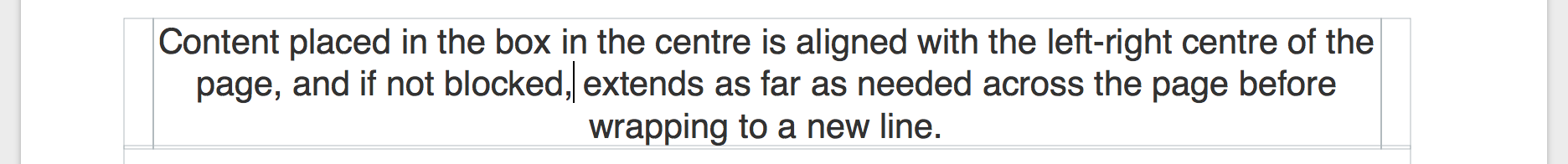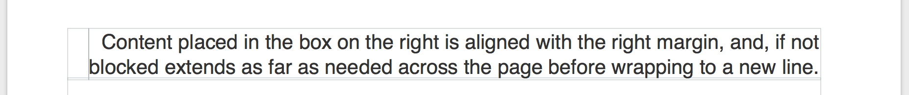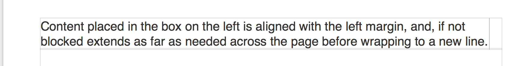 Content placed in the box on the left is aligned with the left margin, and, if not blocked extends as far as needed across the page before wrapping to a new line.