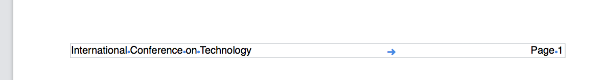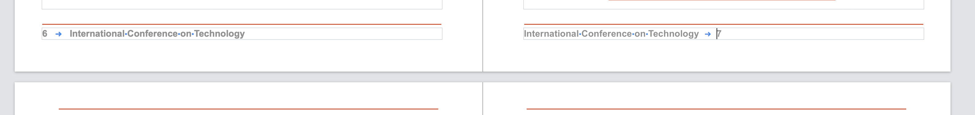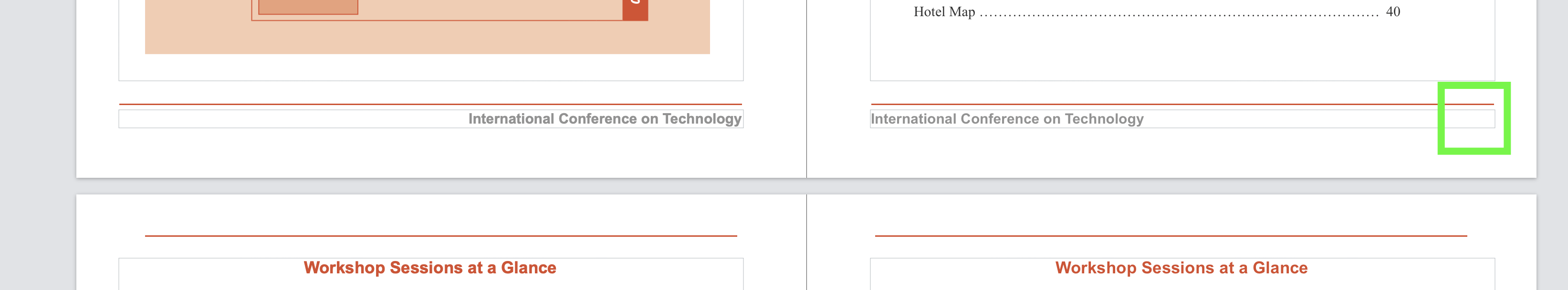I want to put mirrored/facing pages numbers on my Pages doc. I've got the "Left and Right are different" box checked and everything. I want the page # to go in the green box, or away from the spine. How can I do this while still keeping "International Conference on Technology" left aligned? I can't even see how to add another text box to the footer. Help!