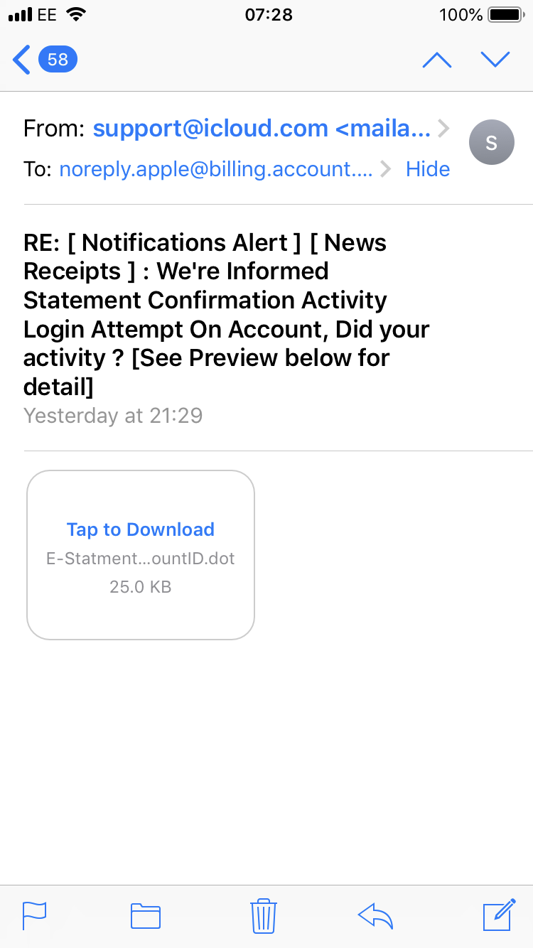 Apple will always address you by your name or the name they have on file for you, not Dear Customer, Dear Client or by using your e-mail address. The e-mail will be from @apple.com or @iTunes.com. E-mail addresses can be spoofed. You can go to Mail/View/Message/Show all Headers to see more. Apple e-mails will never contain an attachment. Apple will never request personal information by email such as Social Security numbers, your Mother’s maiden name or full credit card numbers .