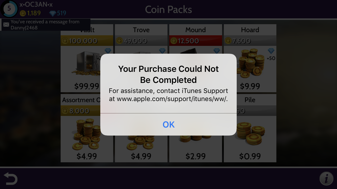 hello, I have an issue with this game I am currently playing. Everytime I try to buy coins for the game I get a message “Purchase Could Not be Completed”