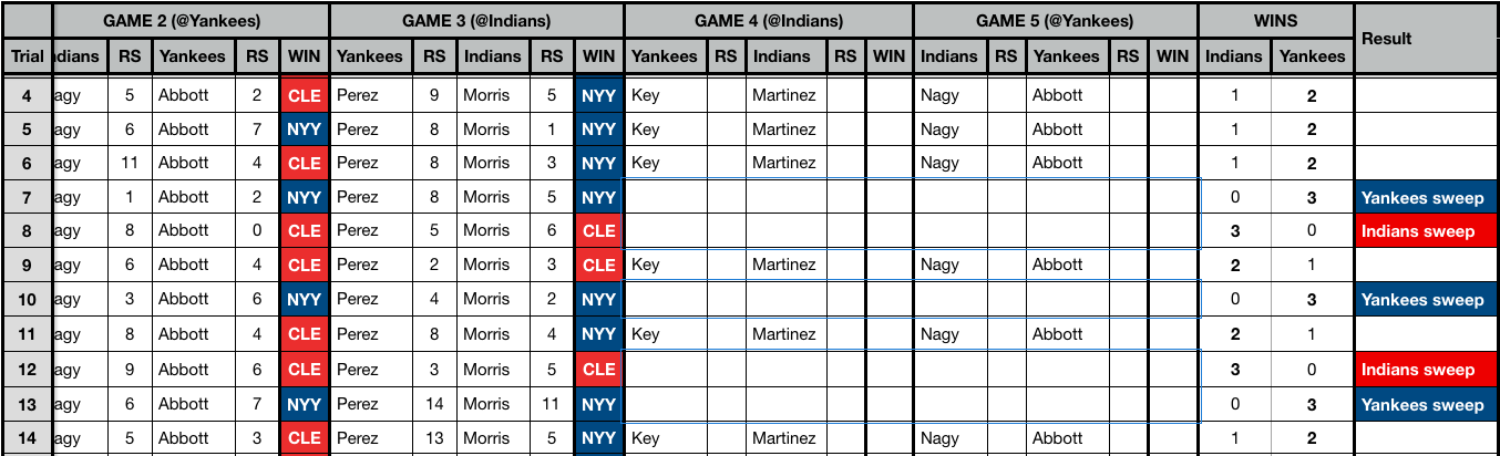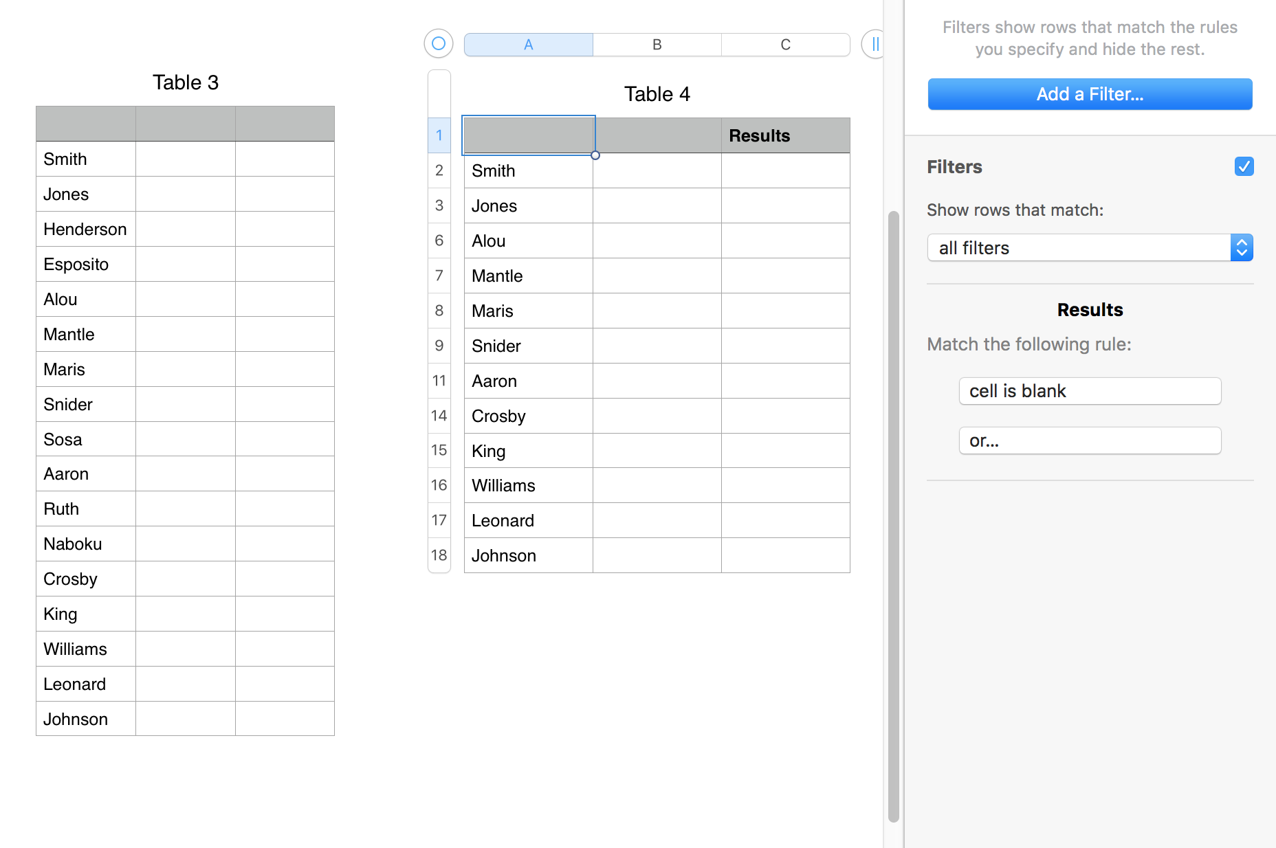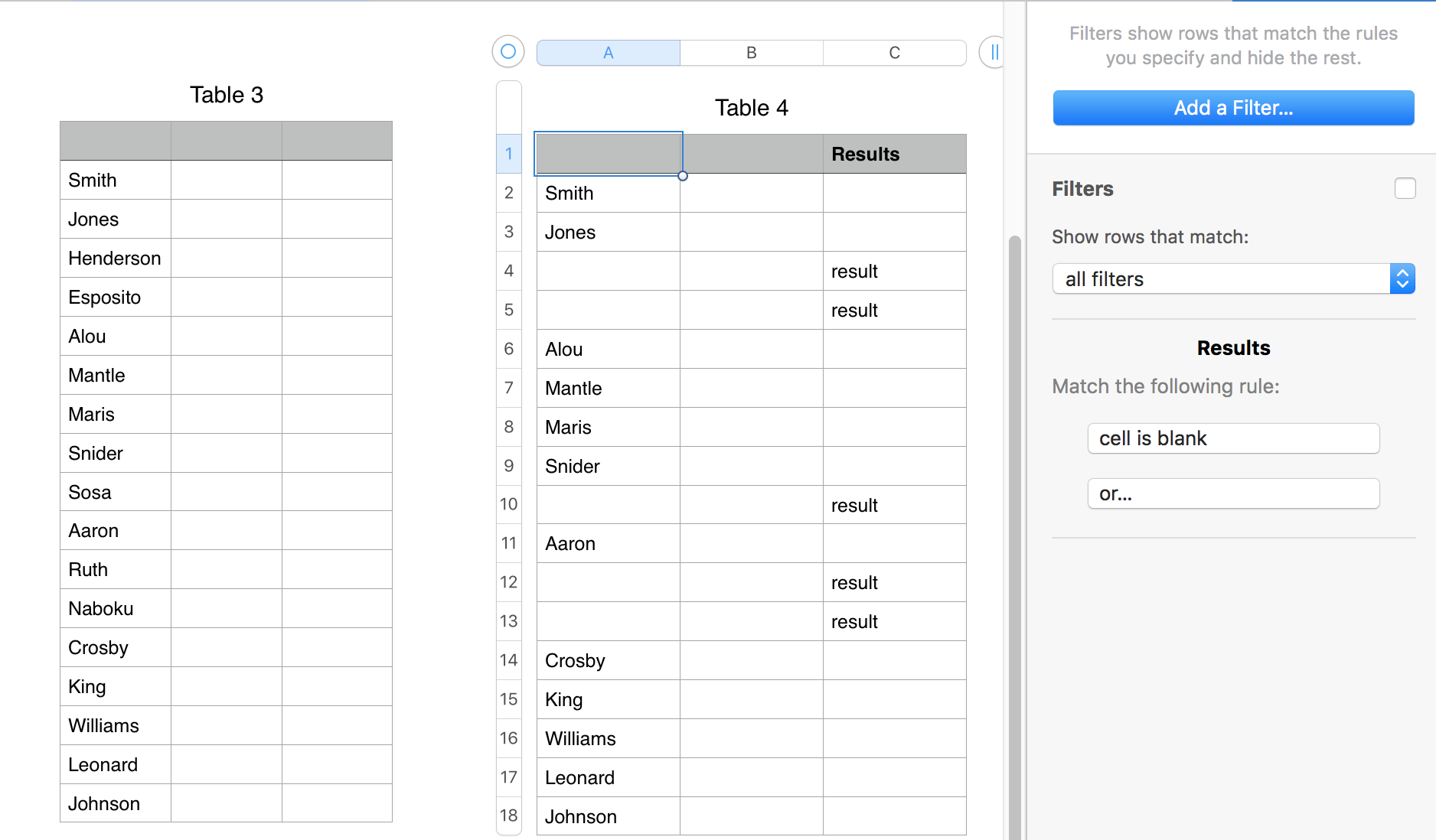 The rows where the Result column is already filled (the selected cells in the screenshot), will not need more text, so when I repeat the procedure for the "Game 4"and "Game 5" sections, I want to have Numbers skip over the selected cells in those columns.