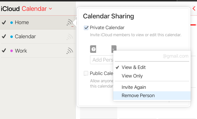 I can't delete ONE person a shared my calendar. This person was a former worker in my company. Still not anymore working for us. I want to delete the share, but i can't in anyway, not at iPhone, not at iPad, not at Mac and even not directly on the icloud!!