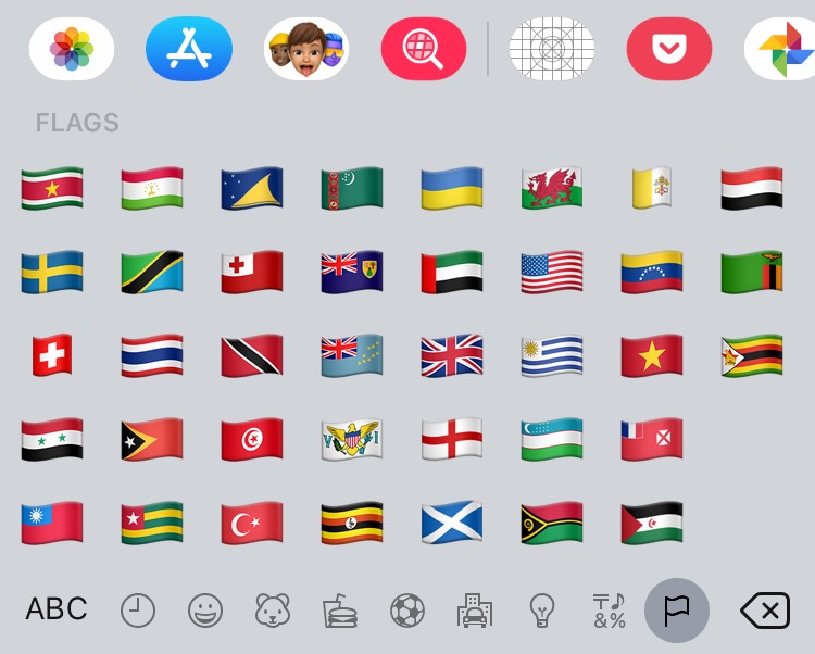 Tap the emoji 😀 button. In the bottom row of categories, tap the far right icon of the flag. With the iPhone held vertically (at least on my 6s), the US flag is second from the top, second column in from the right.
