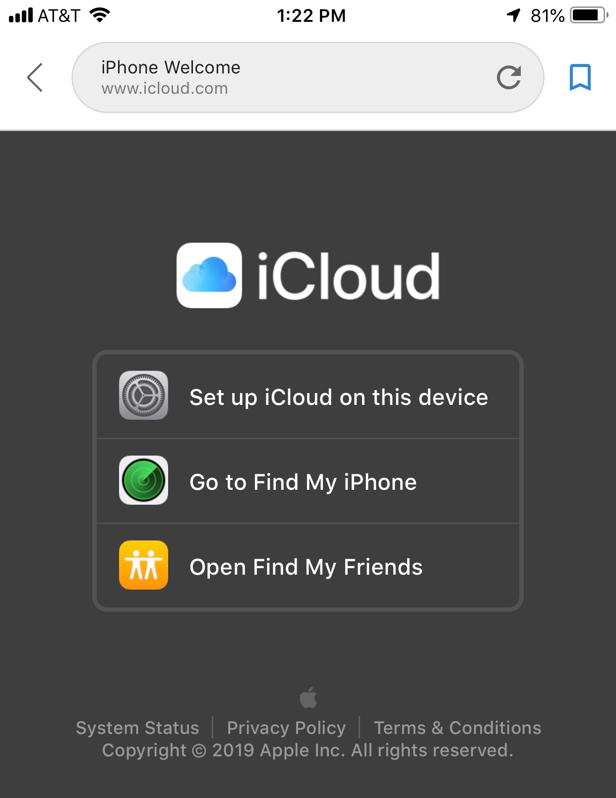 When I type www.icloud.com (regardless of browser) I get a screen that gives me three “options” 1) Setup iCloud on this device 2) go to FindMyPhone 3) open Find my friends.
