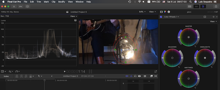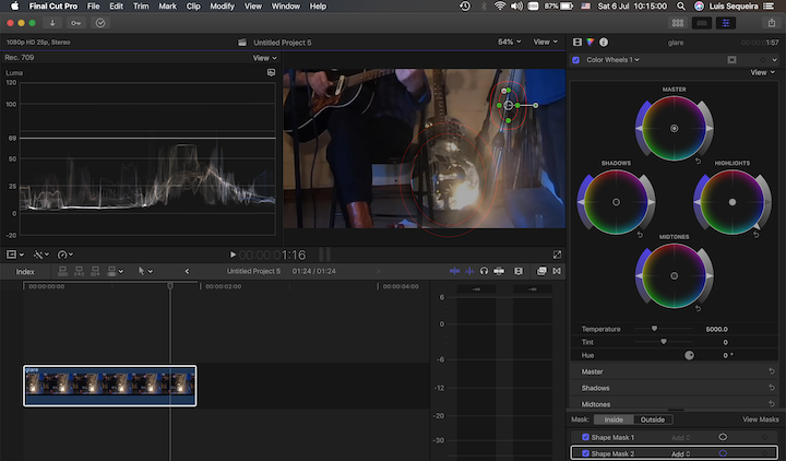 2) Open the Inspector (command-4) and add a new color correction. You can press command-6 to add a color correction, or click the colored prism at the top. Select Color Wheels. Add a shape mask: