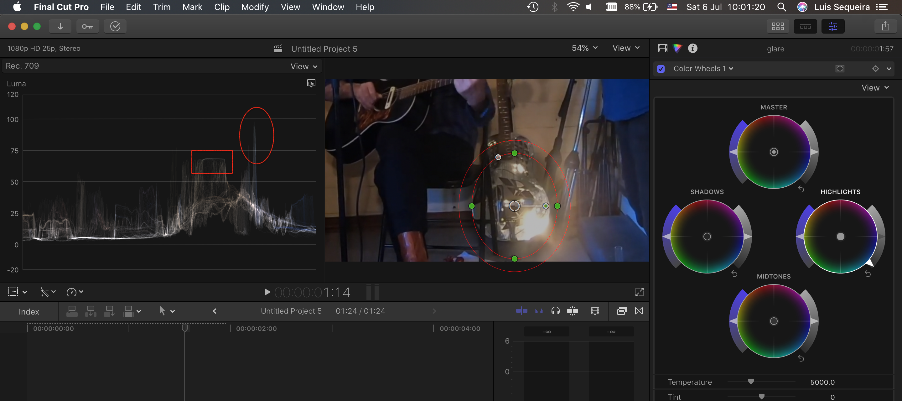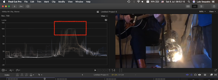 I recently shot some video for some friends to make a promotional video for them. What I didn’t realise was that one of the guitars had a terrible glare from its face and I’m just wondering if anybody has any ideas how I might get rid of it or can direct me to an appropriate tutorial