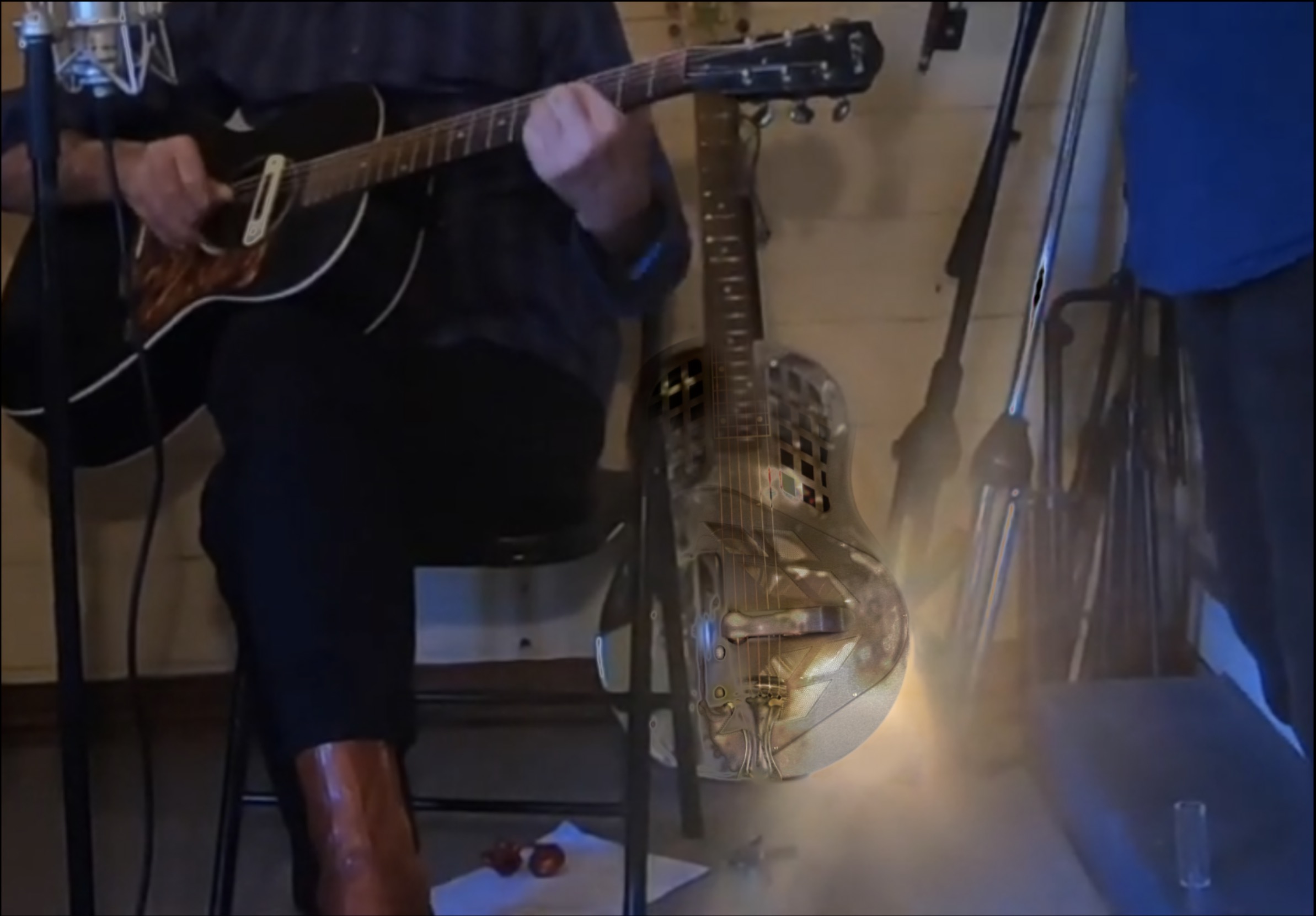 The first thing I did was find another National Reso-phonic image that roughly matches yours (same soundhole design). You could probably simply reshoot a photo with everything arranged (roughly) the same with better lighting. I "keyed" (or color masked - the glare region) a hole in your image and replaced it with the duplicate (sized and rotated to match yours)... Only where the glare area is (the substitute is not an exact likeness of your guitar but close enough to blend.) You only want to "patch in" only as much as needed. (Some feathering is involved to help match the pieces.)
