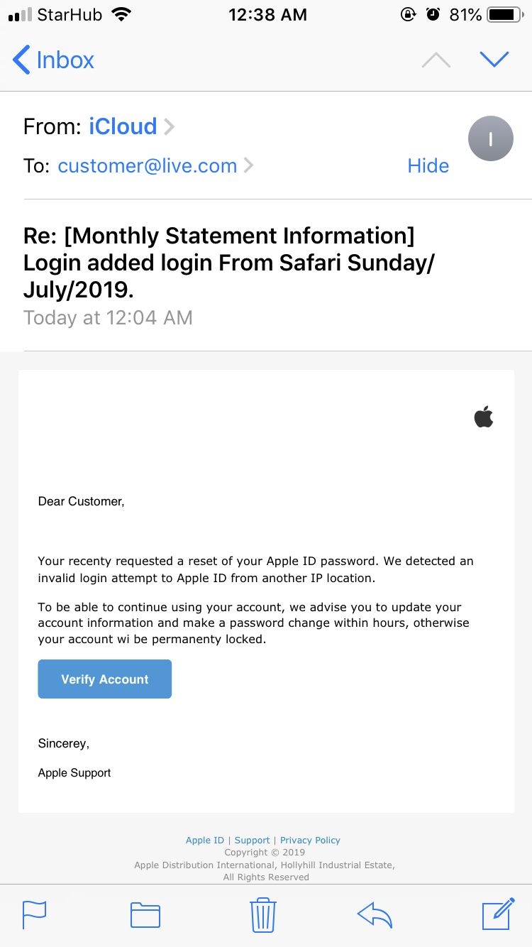 Your first clue that this is spam should be the salutation. Apple would always use your name and not Dear Customer.