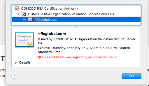 When accessing one of our bank accounts online both my wife and I have been getting a certificate error when entering the bank site's bill paying section. Other parts of the site do not trigger an error. Both us are running El Capitan 10.11.6 (15G22010) and Safari 11.1.2 (11605.3.8.1).