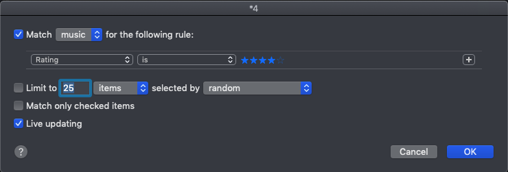 The first screenshot shows the rules for a smart playlist of songs with a rating of four stars. But the resulting playlist includes songs with no rating. Not ALL songs with no rating. Just some. Also attached is the info for one such song that the four-star playlist is including. Am I missing something obvious?