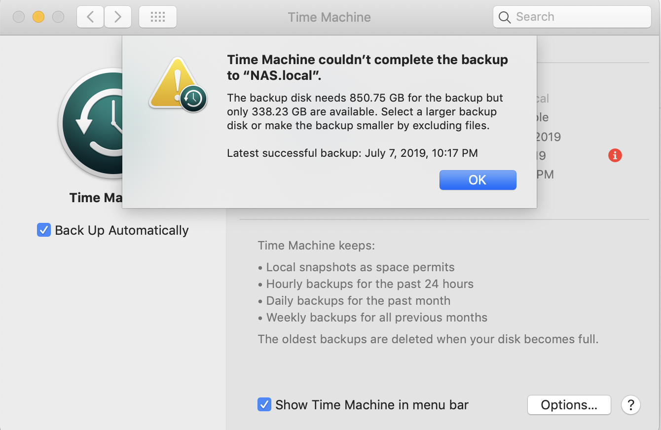 Time Machine seems to have worked correctly from system setup on June 25, 2019 until today July 9, 2019 (15 days). Now getting popup with Backup Failed There isn't enough space on NAS.local. Detail screen: