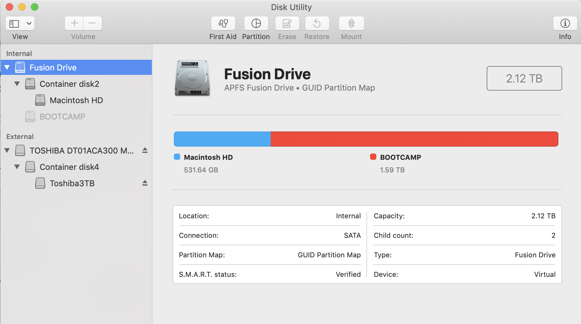 System has 2TB Fusion drive partitioned 532 GB for Mac and rest for Boot Camp.