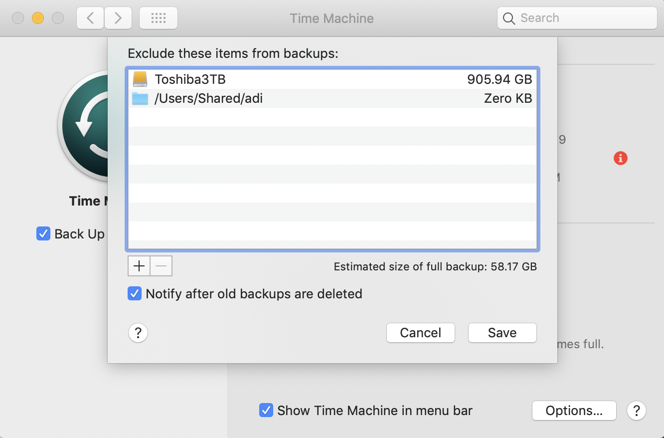 3 TB Toshiba attached via USB, and is listed in the Time Machine Exclusion screen.