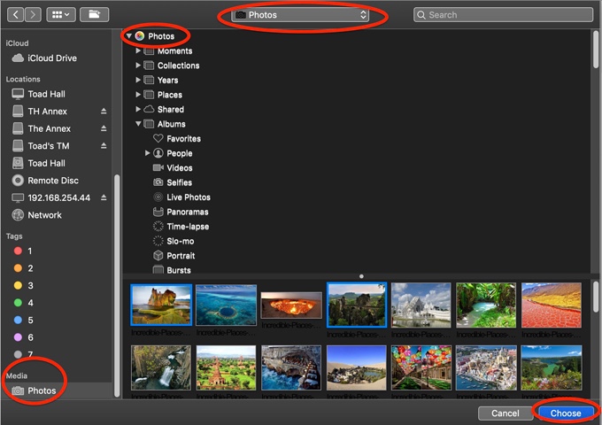 You need to use the "choose photo" option of each website and your browser. In your browser you'll see a window like the one you get when you select a photo to add to a post here. In the sidebar go down to Media and click on Photos. Then click on the Photos icon to get to your library.