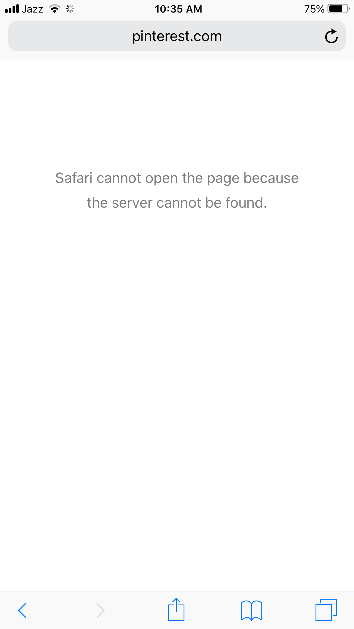 Recently this problem started showing up where safari won’t load Pinterest. Every time I hit the link it says server cannot be found. Same happened to wattpad and tumblr last month but I ignored it. I’ve tried clearing browser history and restarting the phone but it’s useless. It keeps on showing the same message.
