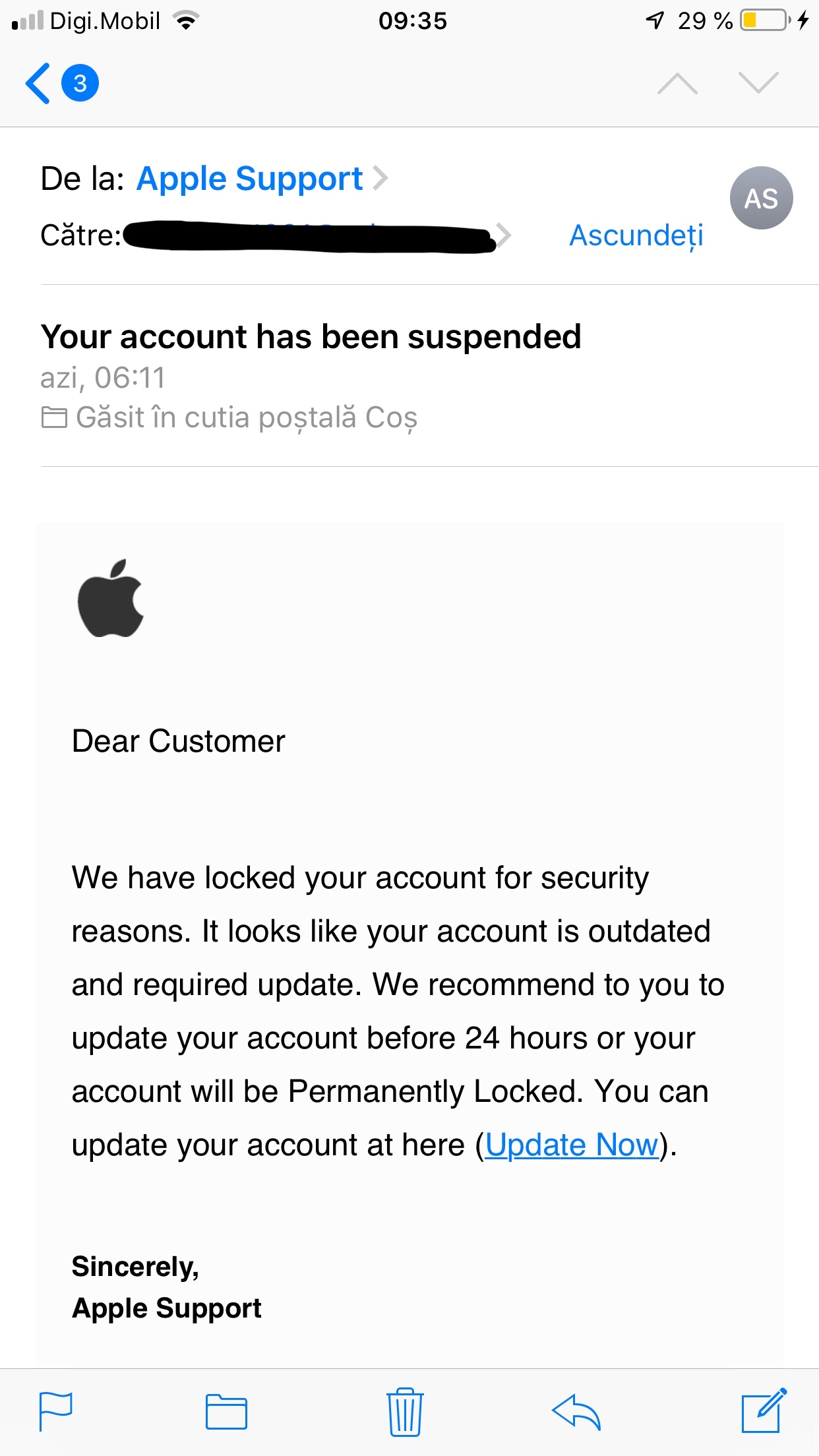 We have locked your account for security reasons. It looks like your account is outdated and required update. We recommend to you to update your account before 24 hours or your account will be Permanently Locked. You can update your account here (update now).