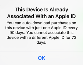 “When you try to associate another Apple ID with a device that was already associated, you might see a message that says, "This device is associated with another Apple ID. You cannot associate this device with another Apple ID for [number] days." Depending on when you associated your device with your Apple ID, you might need to wait up to 90 days to associate the device with another Apple ID.”