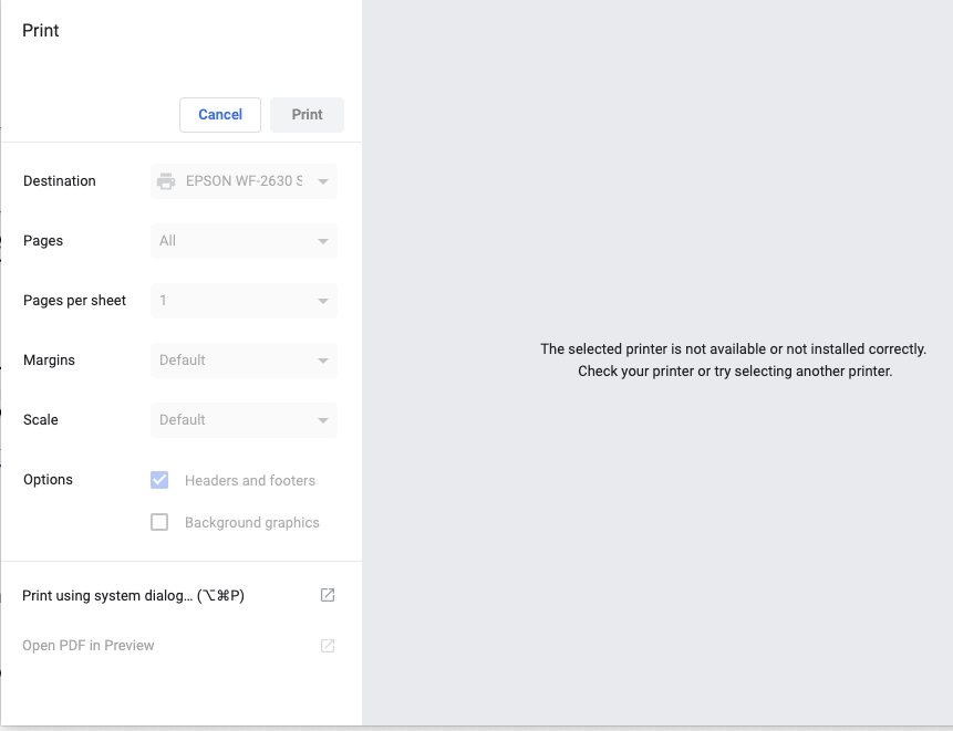 On the Print Dialogue screen, I can still print if I choose the "print using system dialogue" option.