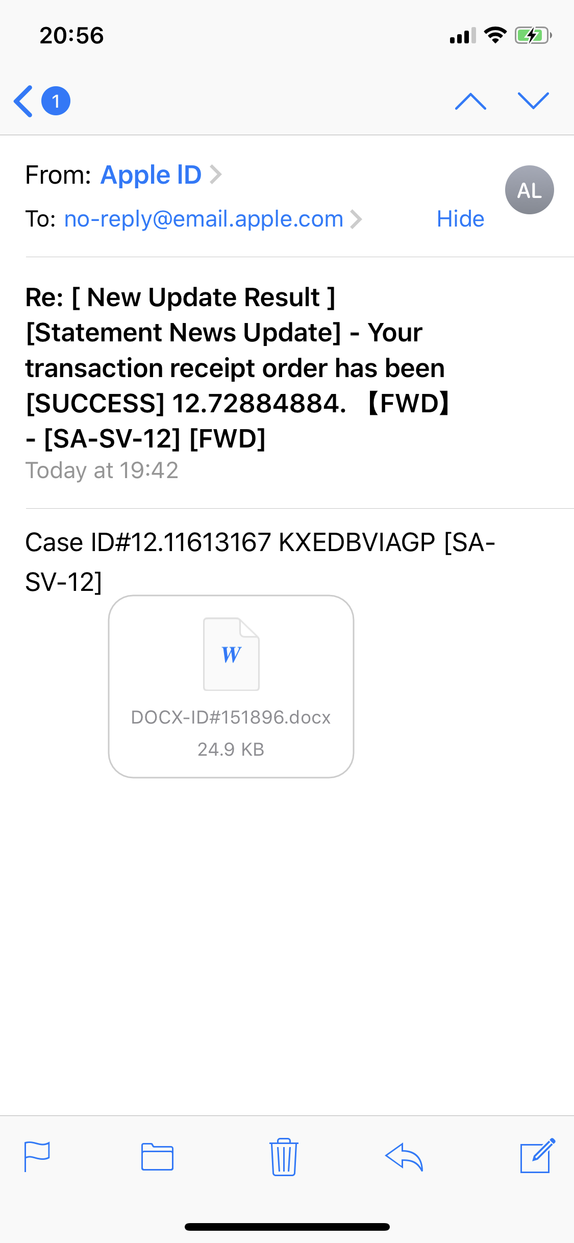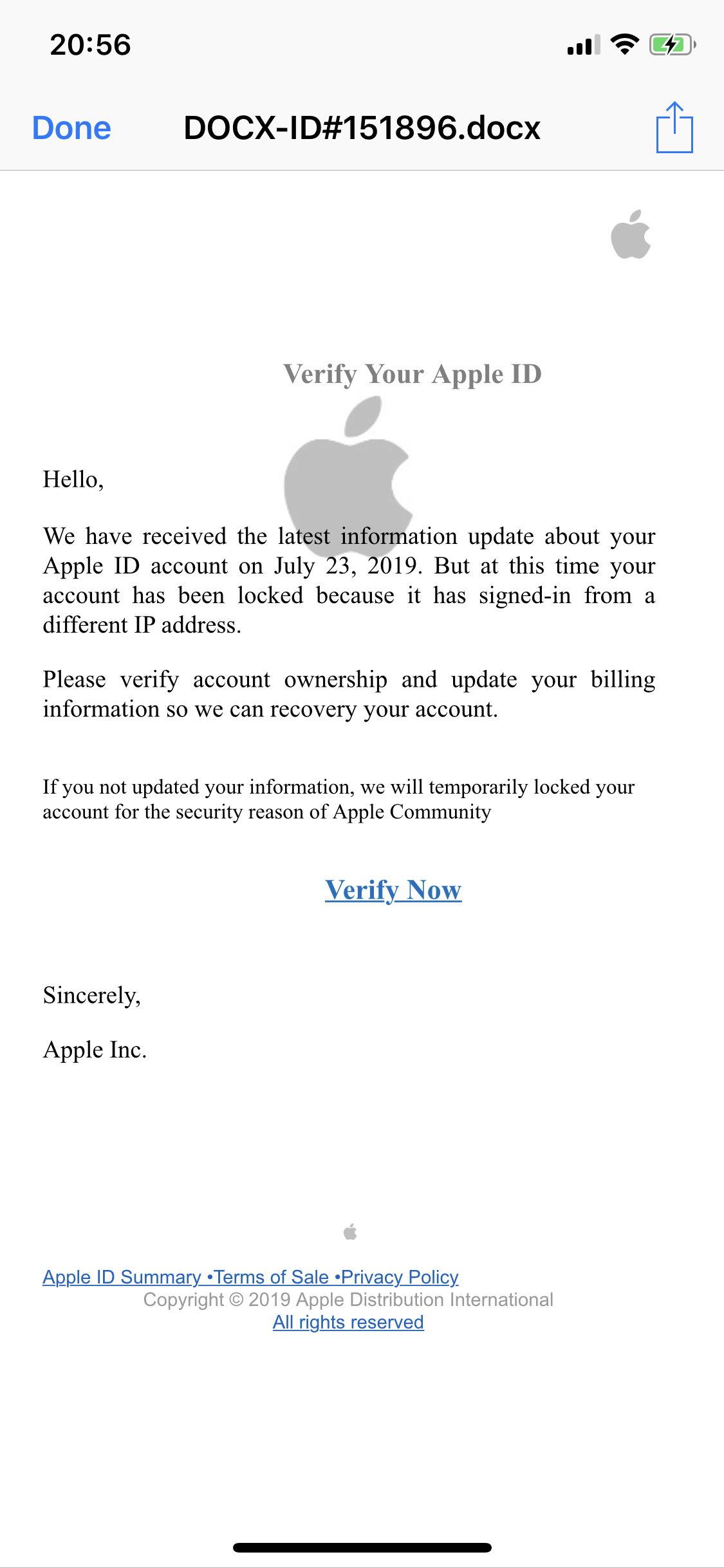 Apple will always address you by your name or the name they have on file for you, not Dear Customer, Dear Client or by using your e-mail address. The e-mail will be from @apple.com or @iTunes.com. E-mail addresses can be spoofed. You can go to Mail/View/Message/Show all Headers to see more. Apple e-mails will never contain an attachment. Apple will never request personal information by email such as Social Security numbers, your Mother’s maiden name or full credit card numbers .
